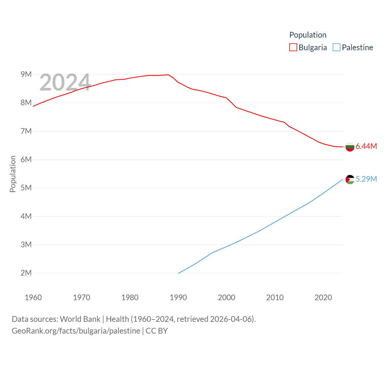 Bulgaria has a population of 6.44M (ranked 110/197), compared with 5.29M in Palestine (ranked 122/197). Bulgaria's land area is 41,915 sq mi versus 2,326 sq mi for Palestine (ranked 101st vs. 164th).