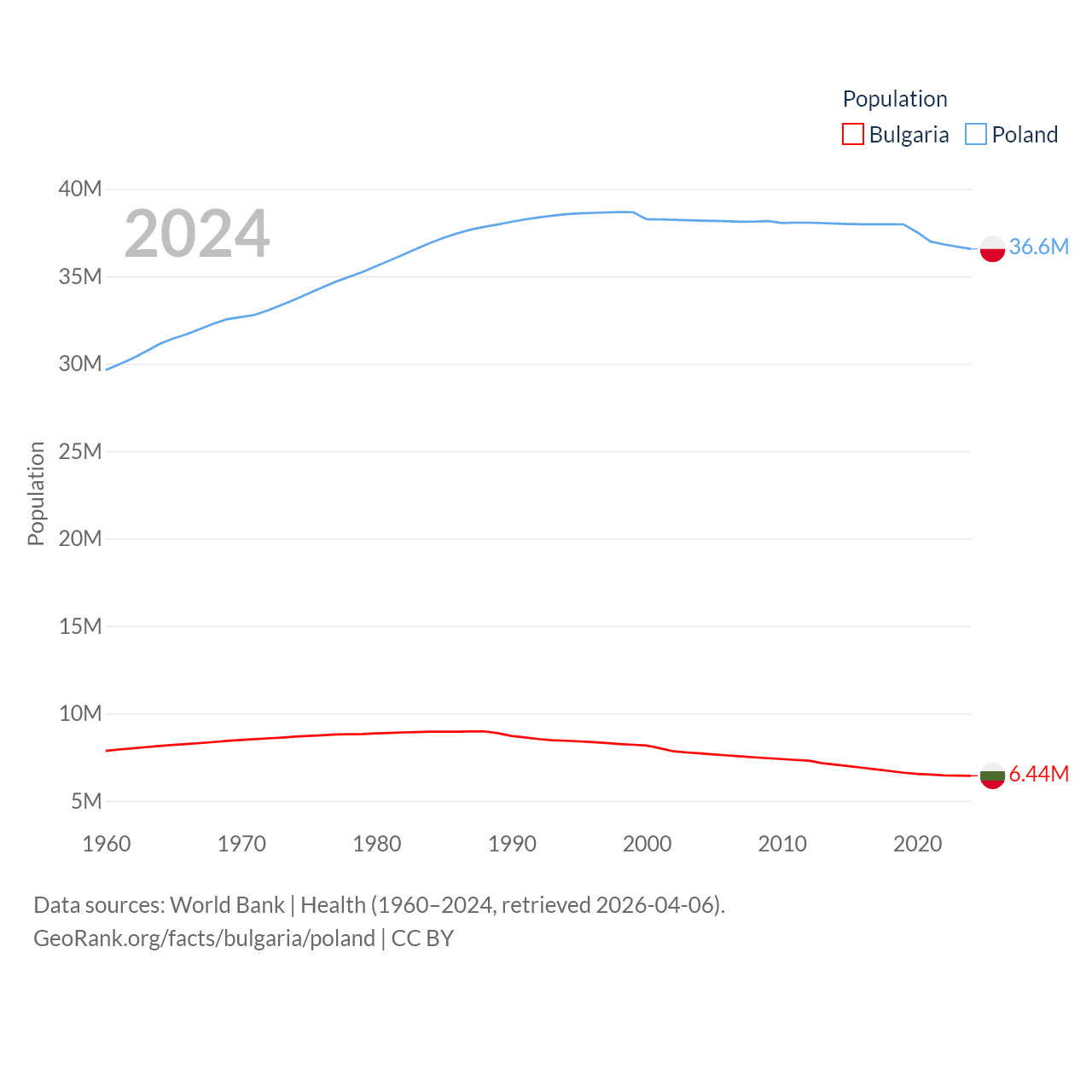 Bulgaria has a population of 6.44M (ranked 110/197), compared with 36.6M in Poland (ranked 42/197). Bulgaria's land area is 41,915 sq mi versus 118,252 sq mi for Poland (ranked 101st vs. 69th).