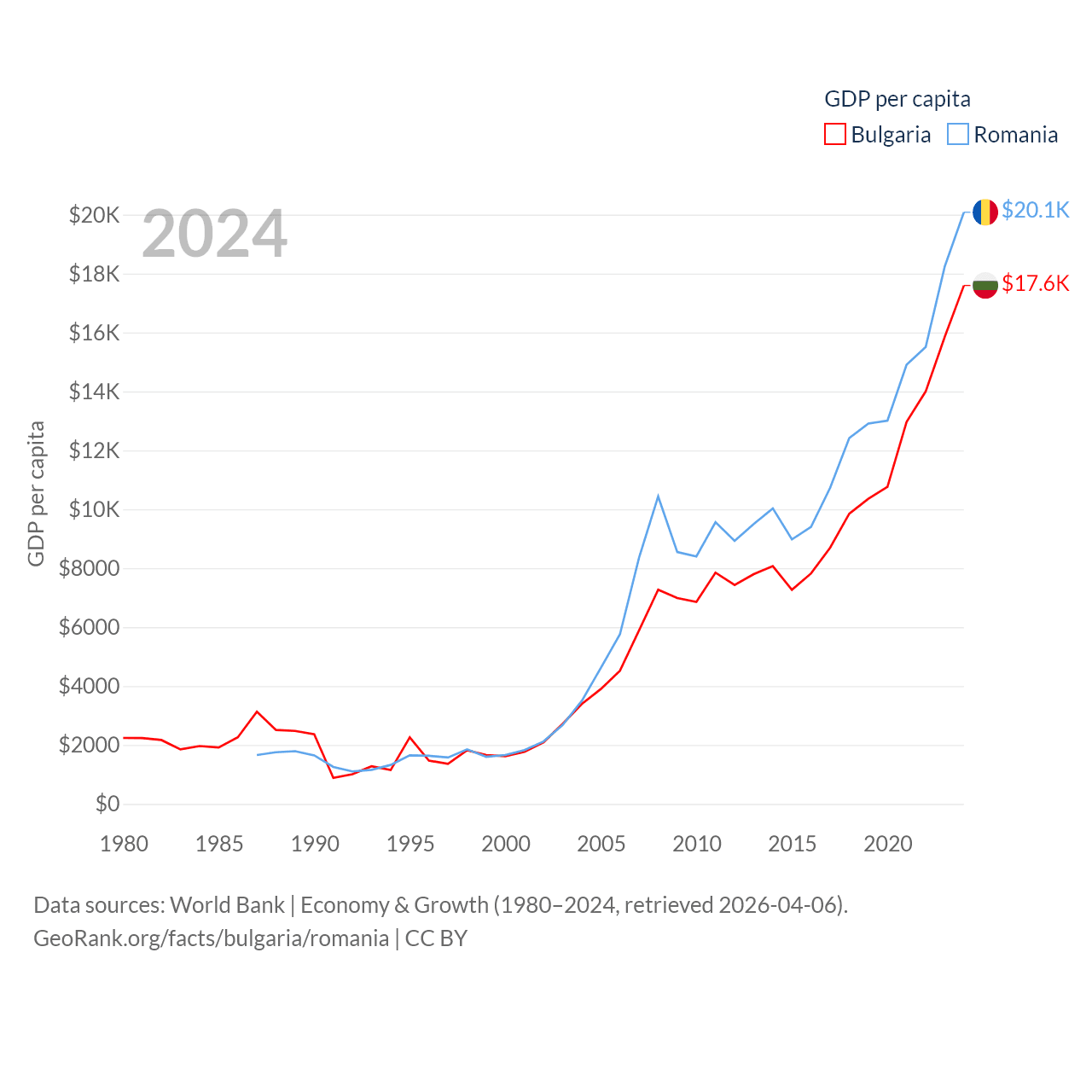 By GDP, Bulgaria ranks 67/197 ($113B) and Romania ranks 42/197 ($383B). By GDP per capita, Bulgaria ranks 64/197 ($17,596), while Romania ranks 58/197 ($20,080).