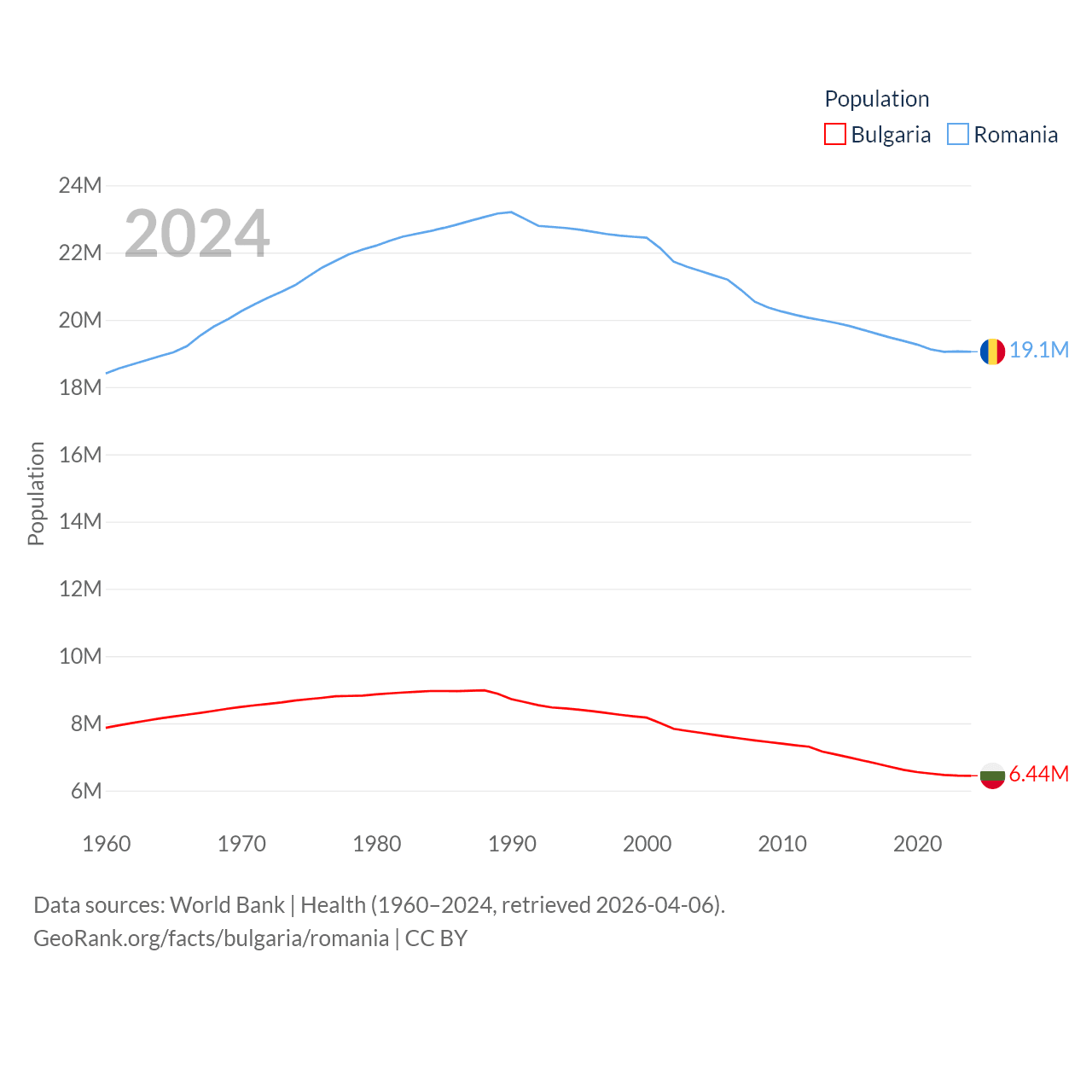 Bulgaria has a population of 6.44M (ranked 110/197), compared with 19.1M in Romania (ranked 67/197). Bulgaria's land area is 41,915 sq mi versus 88,834 sq mi for Romania (ranked 101st vs. 80th).