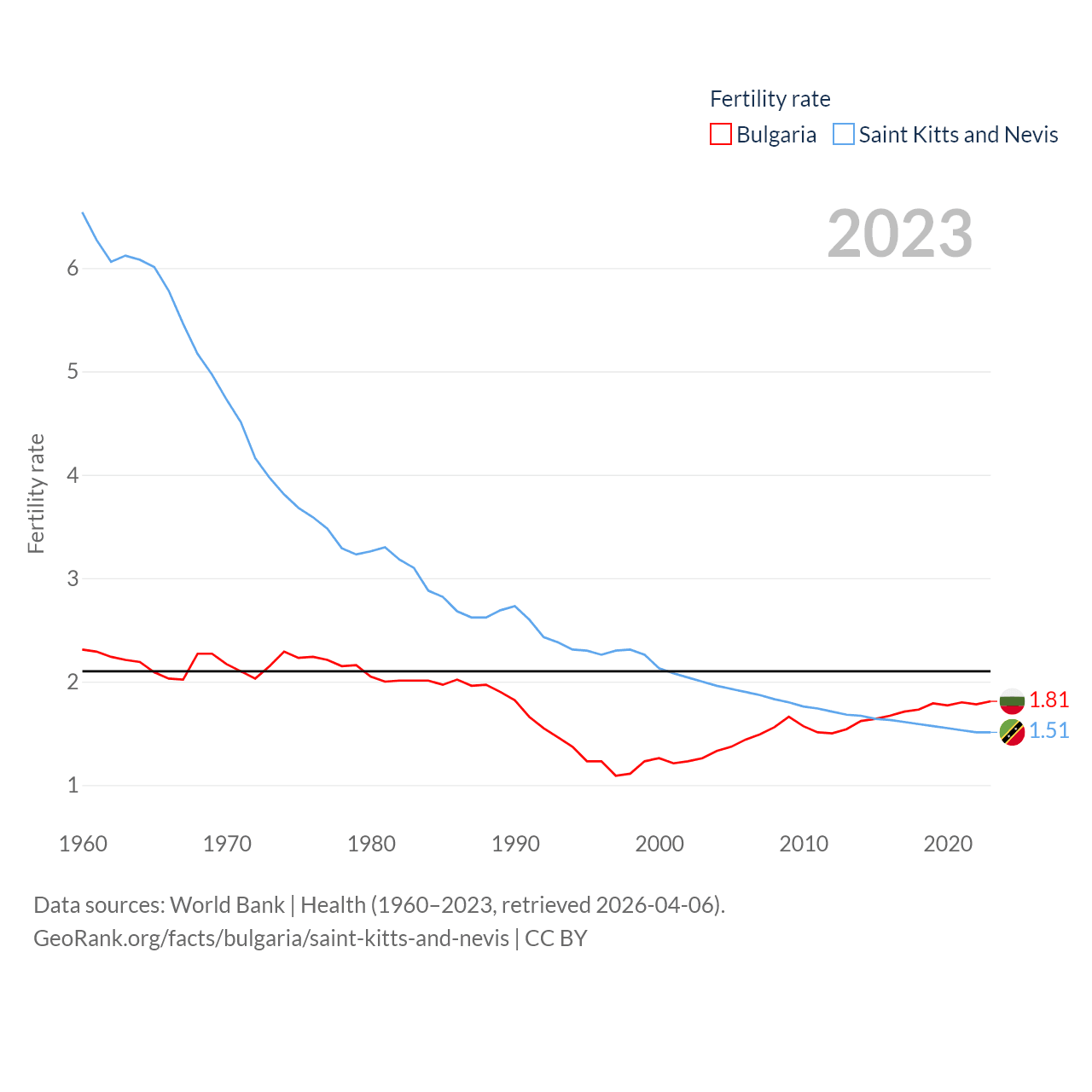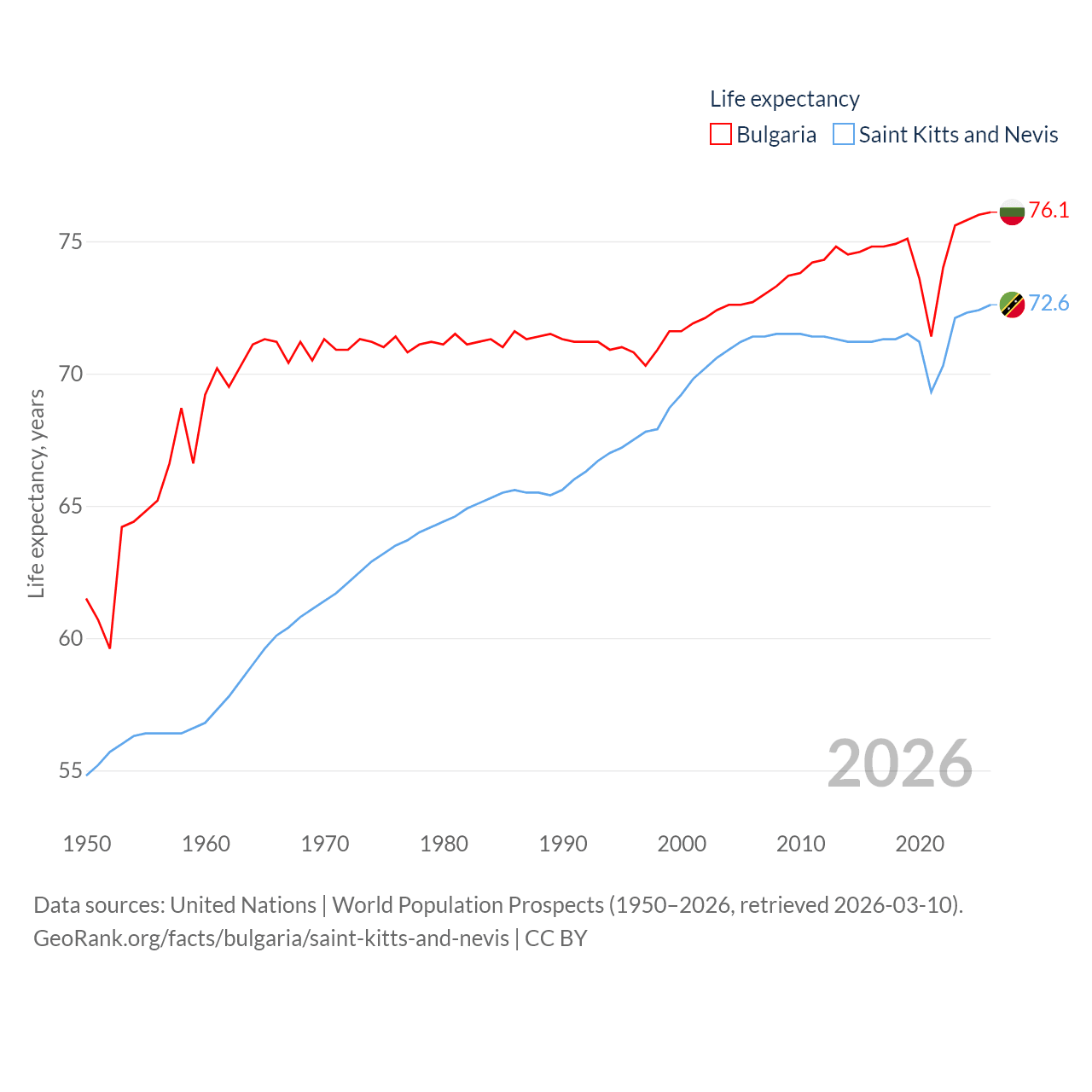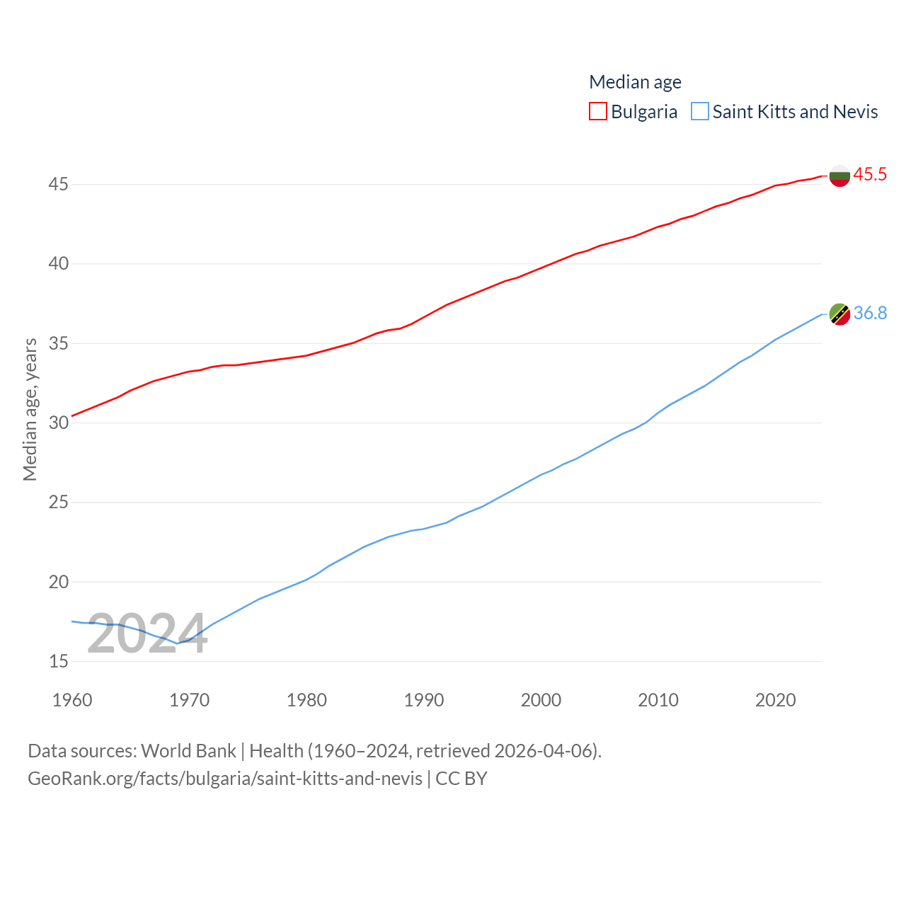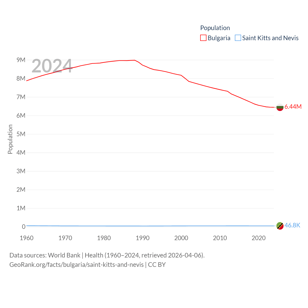 Bulgaria has a population of 6.44M (ranked 110/197), compared with 46.8K in Saint Kitts and Nevis (ranked 189/197). Bulgaria's land area is 41,915 sq mi versus 100.4 sq mi for Saint Kitts and Nevis (ranked 101st vs. 189th).