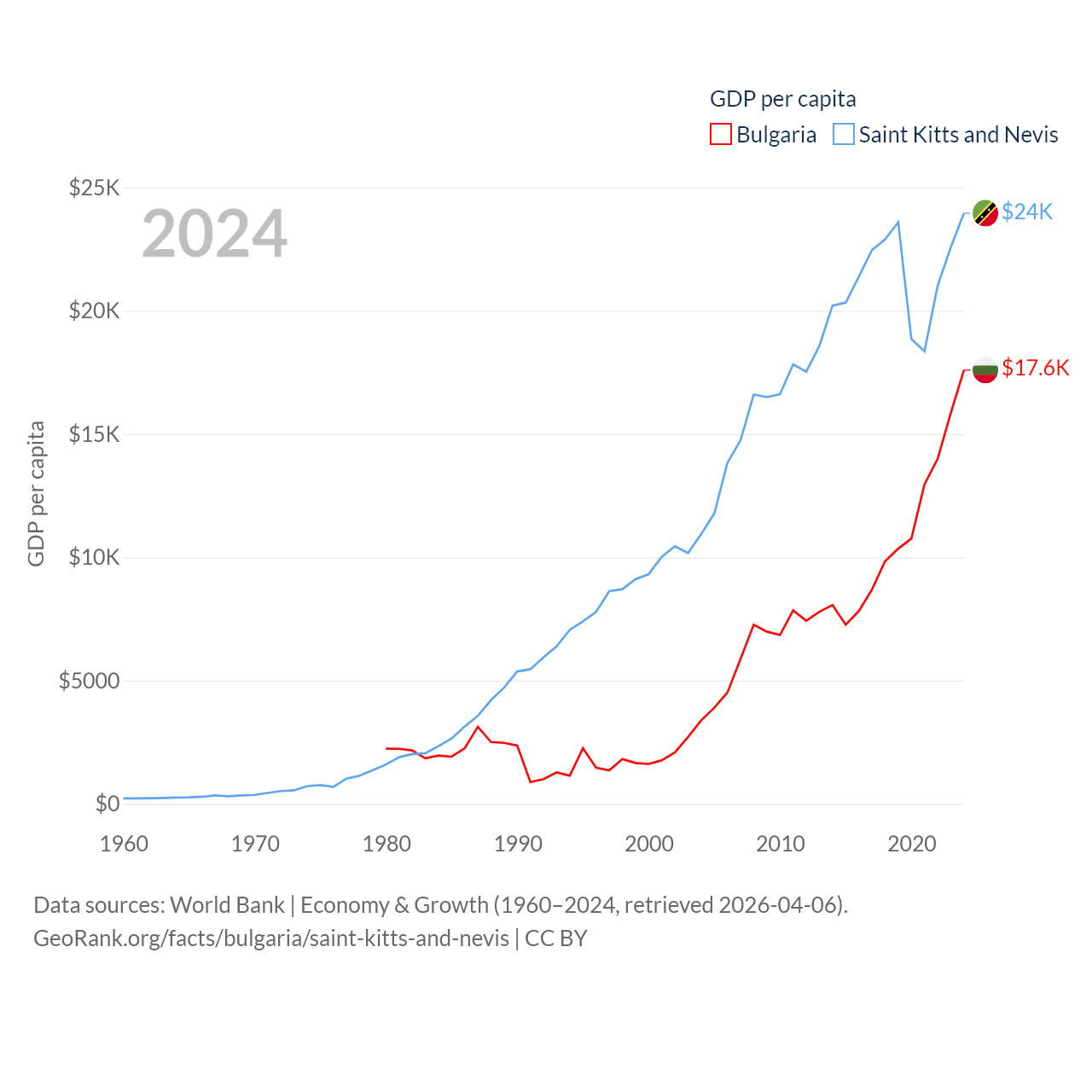 By GDP, Bulgaria ranks 67/197 ($113B) and Saint Kitts and Nevis ranks 187/197 ($1.12B). By GDP per capita, Bulgaria ranks 64/197 ($17,596), while Saint Kitts and Nevis ranks 51/197 ($23,961).