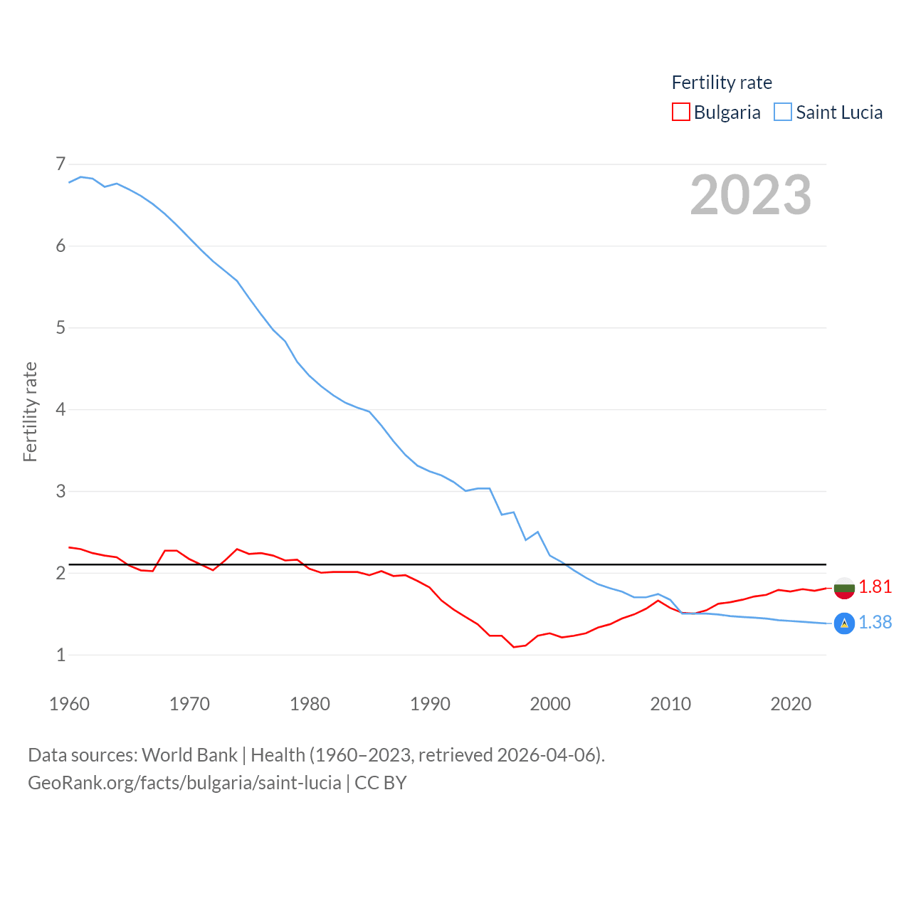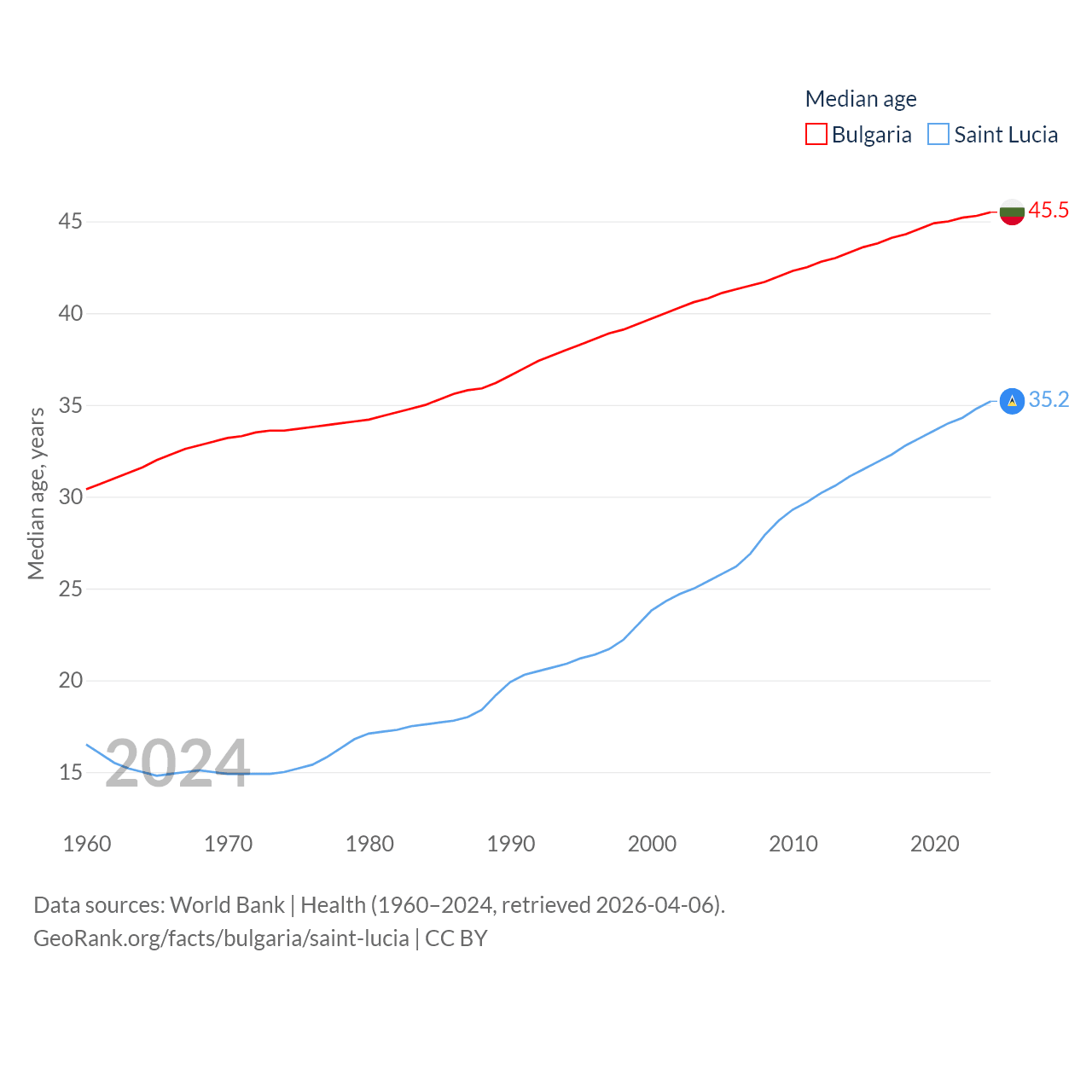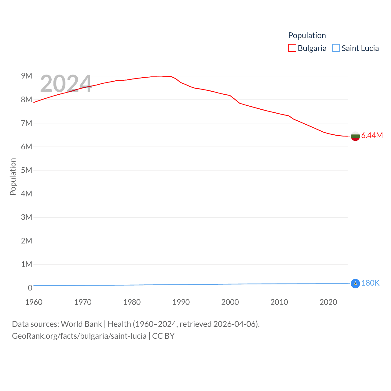 Bulgaria has a population of 6.44M (ranked 110/197), compared with 180K in Saint Lucia (ranked 178/197). Bulgaria's land area is 41,915 sq mi versus 235.5 sq mi for Saint Lucia (ranked 101st vs. 178th).