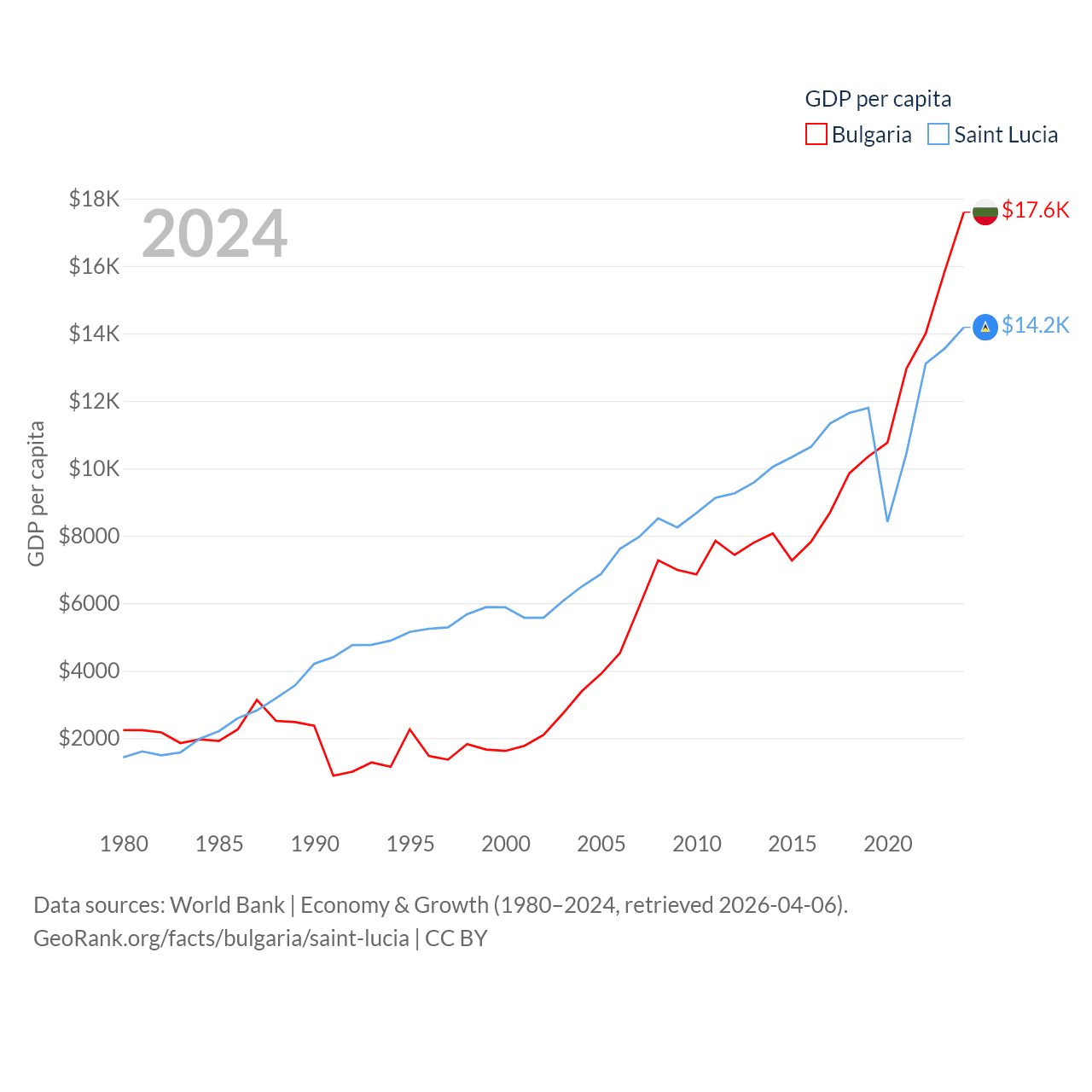 By GDP, Bulgaria ranks 67/197 ($113B) and Saint Lucia ranks 173/197 ($2.55B). By GDP per capita, Bulgaria ranks 64/197 ($17,596), while Saint Lucia ranks 70/197 ($14,182).