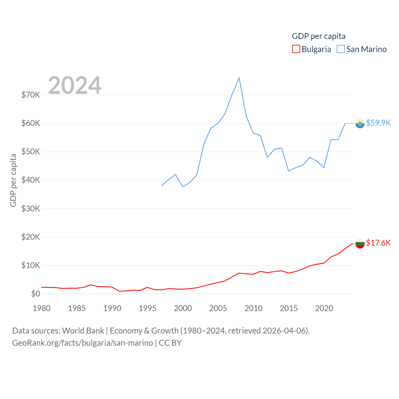 By GDP, Bulgaria ranks 67/197 ($113B) and San Marino ranks 180/197 ($2.03B). By GDP per capita, Bulgaria ranks 64/197 ($17,596), while San Marino ranks 15/197 ($59,880).
