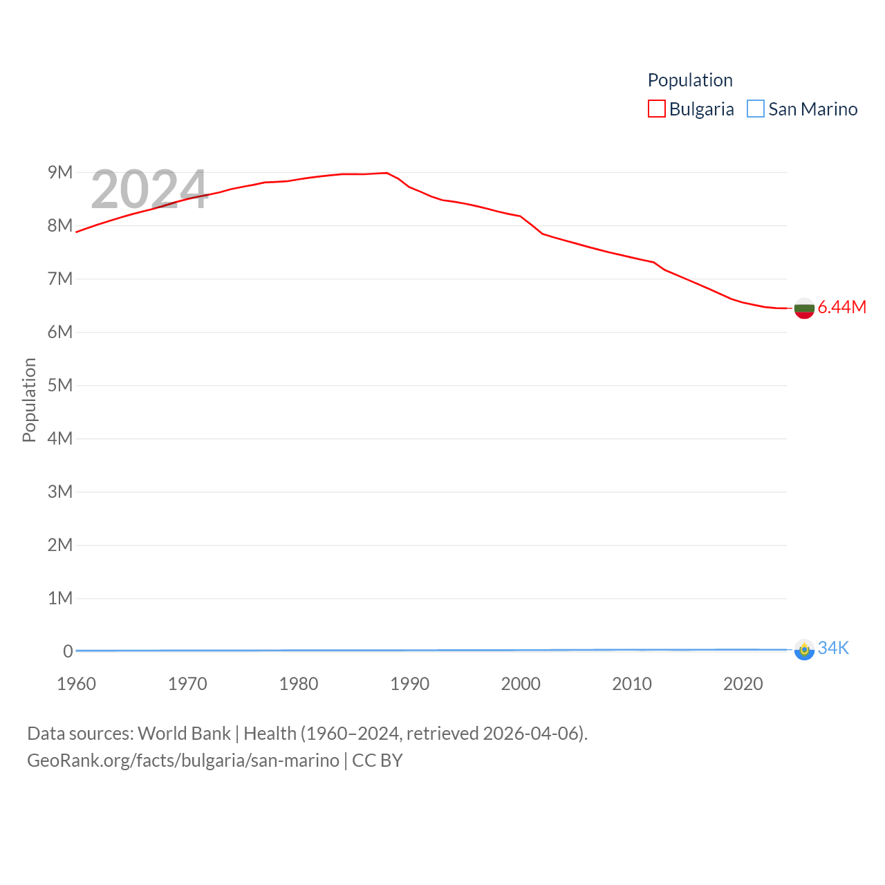 Bulgaria has a population of 6.44M (ranked 110/197), compared with 34K in San Marino (ranked 193/197). Bulgaria's land area is 41,915 sq mi versus 23.2 sq mi for San Marino (ranked 101st vs. 193rd).