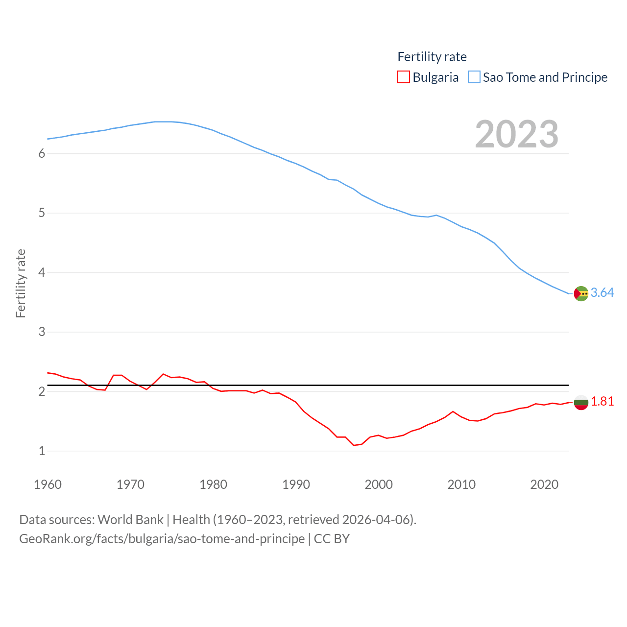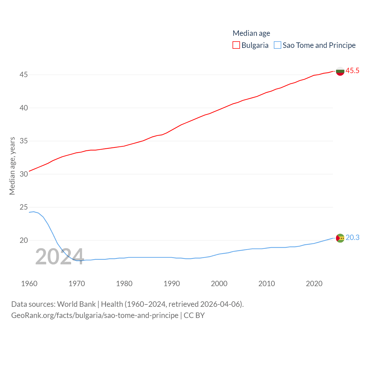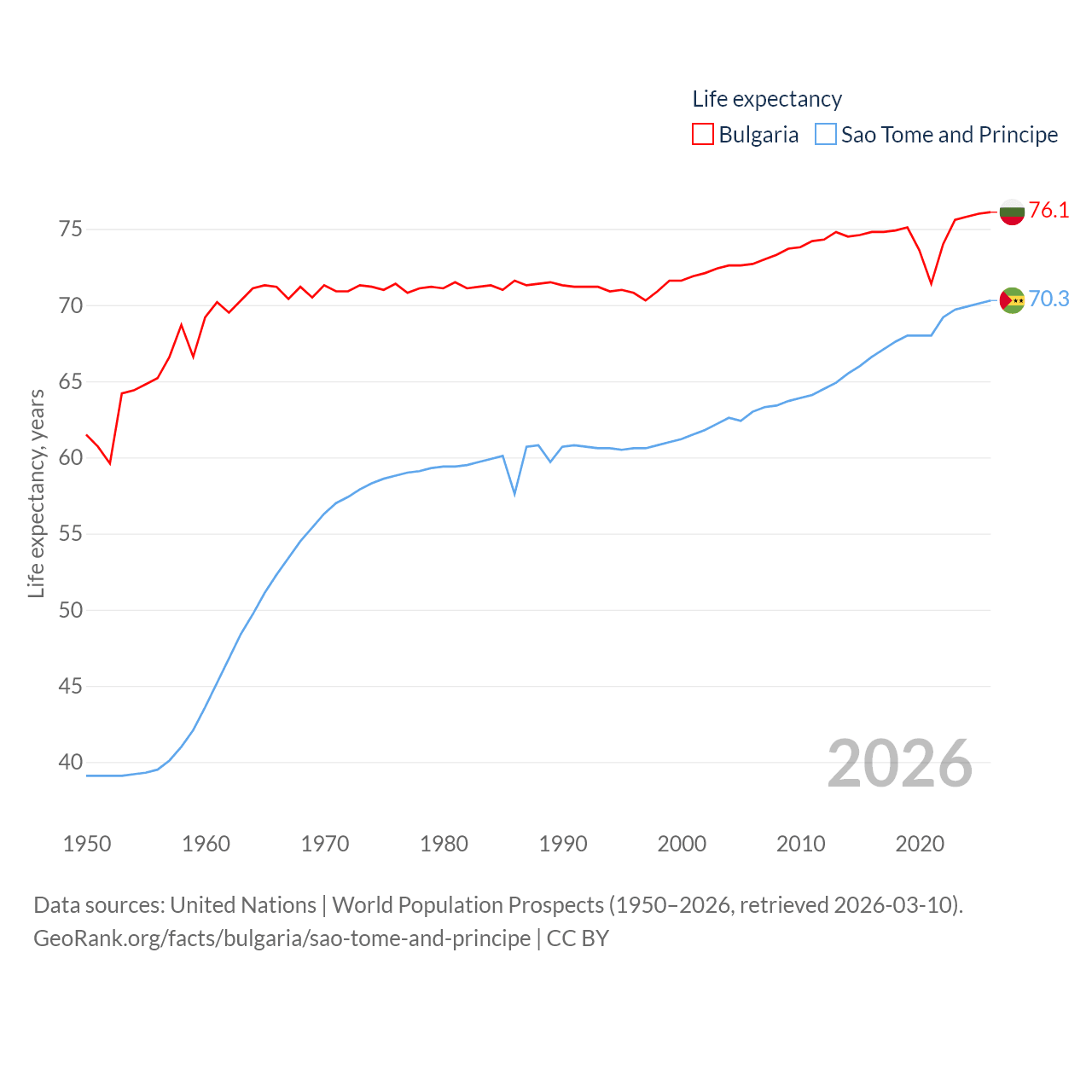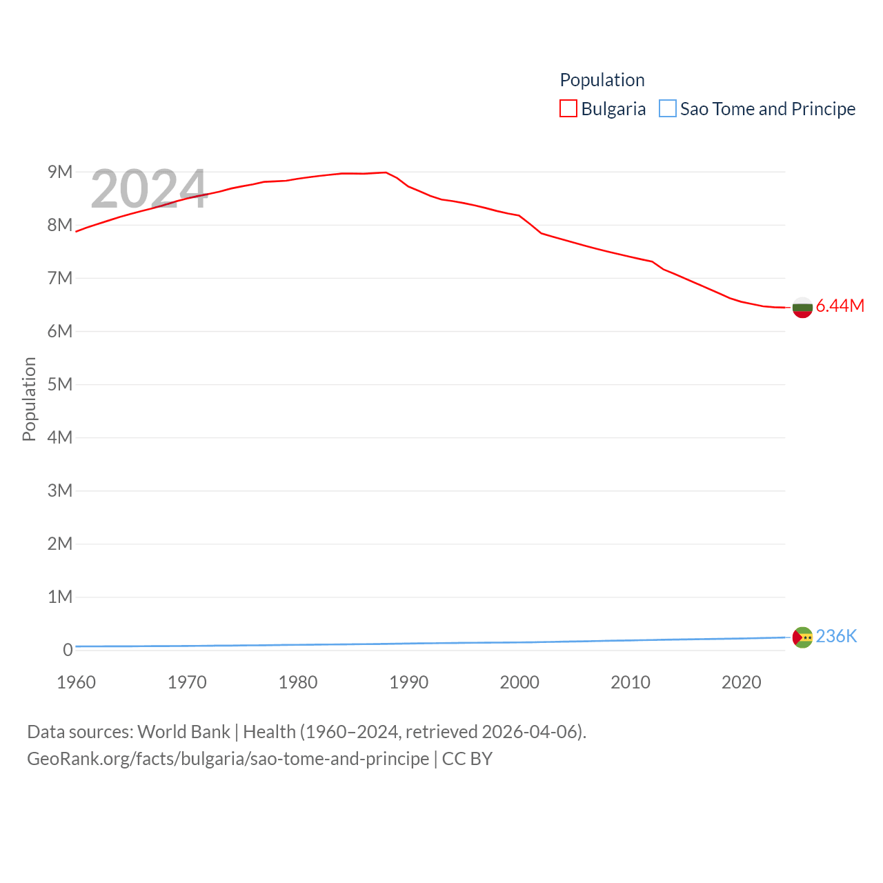 Bulgaria has a population of 6.44M (ranked 110/197), compared with 236K in Sao Tome and Principe (ranked 176/197). Bulgaria's land area is 41,915 sq mi versus 371 sq mi for Sao Tome and Principe (ranked 101st vs. 172nd).
