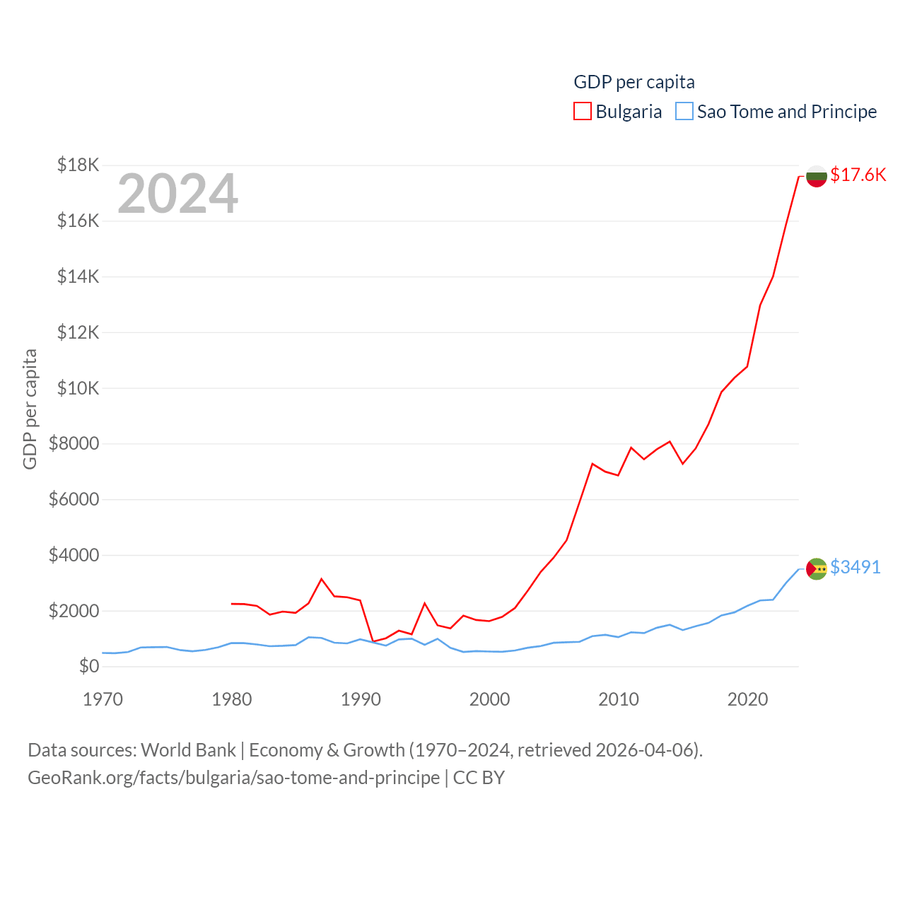 By GDP, Bulgaria ranks 67/197 ($113B) and Sao Tome and Principe ranks 189/197 ($822M). By GDP per capita, Bulgaria ranks 64/197 ($17,596), while Sao Tome and Principe ranks 134/197 ($3,491).