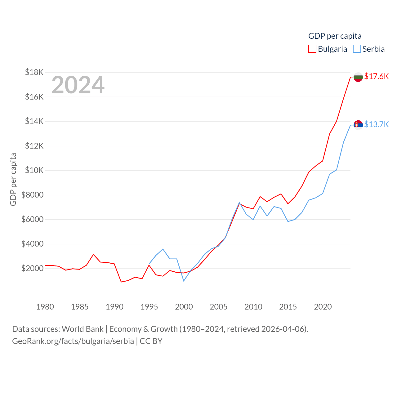 By GDP, Bulgaria ranks 67/197 ($113B) and Serbia ranks 76/197 ($90.1B). By GDP per capita, Bulgaria ranks 64/197 ($17,596), while Serbia ranks 73/197 ($13,679).