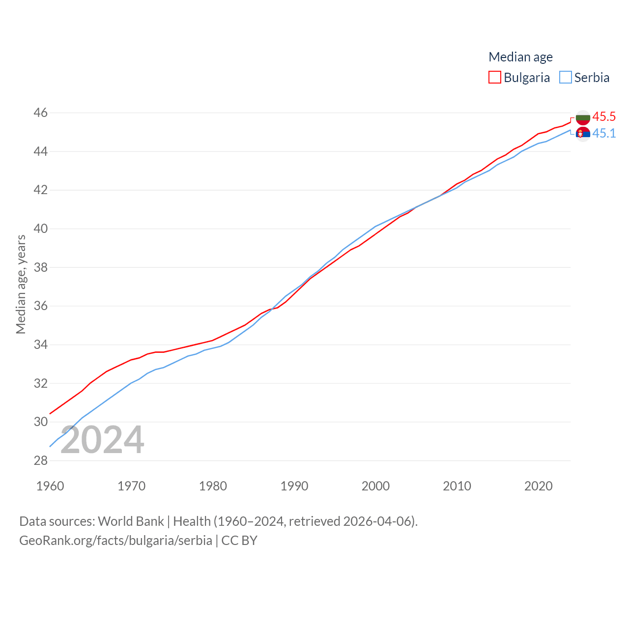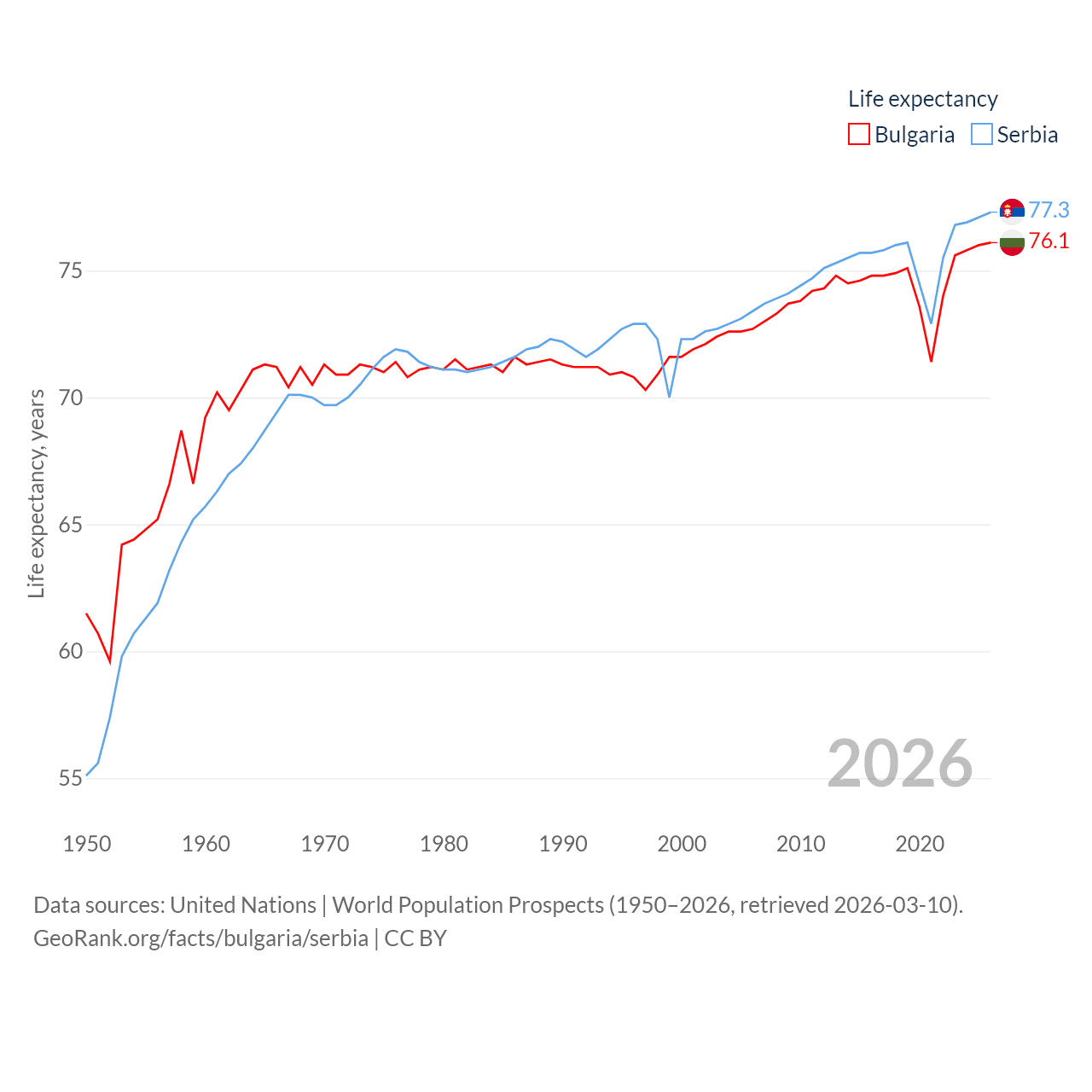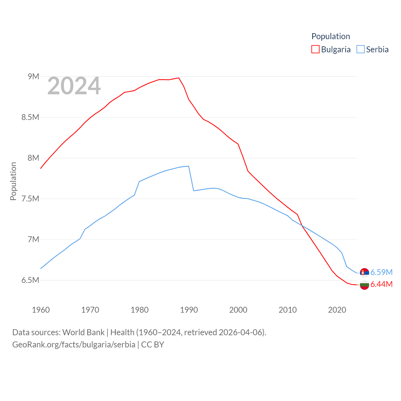 Bulgaria has a population of 6.44M (ranked 110/197), compared with 6.59M in Serbia (ranked 109/197). Bulgaria's land area is 41,915 sq mi versus 32,467 sq mi for Serbia (ranked 101st vs. 111th).
