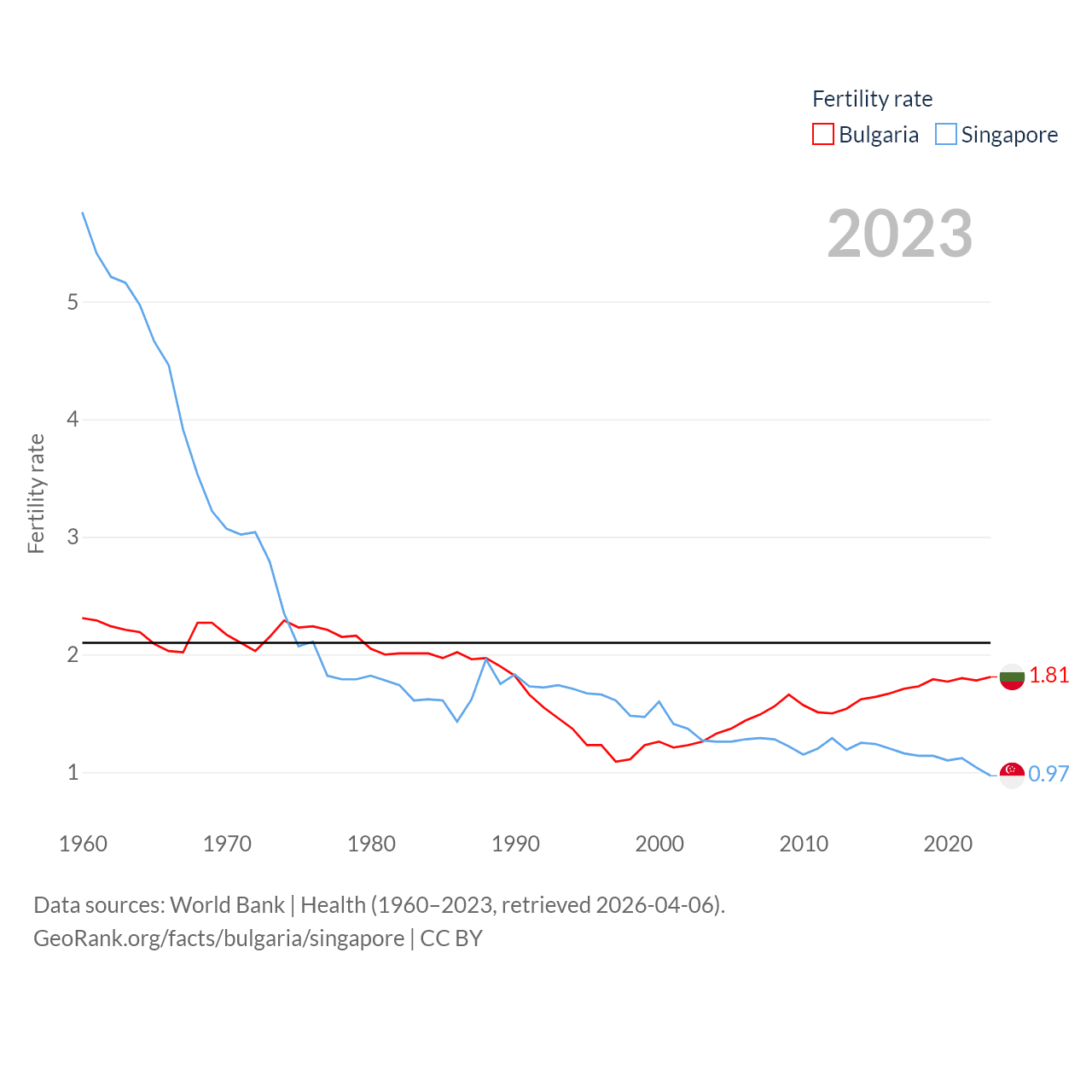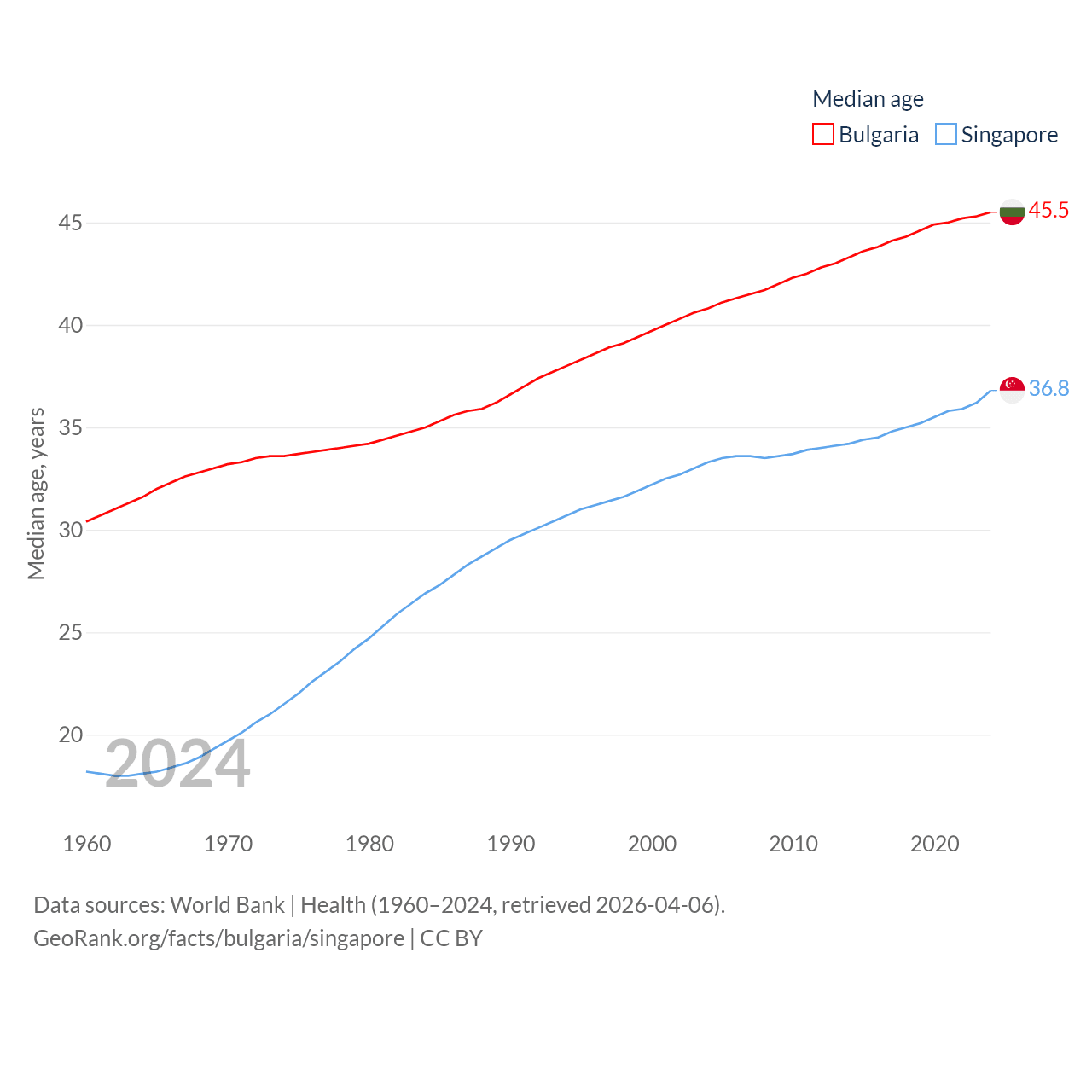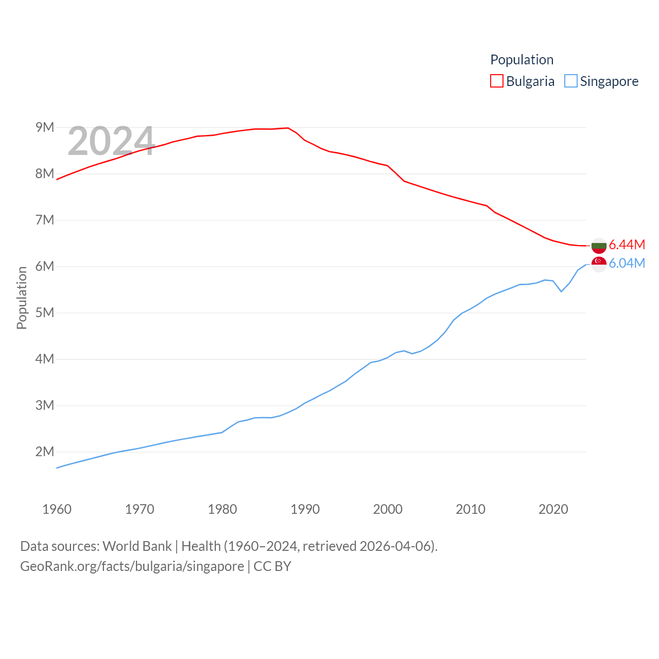 Bulgaria has a population of 6.44M (ranked 110/197), compared with 6.04M in Singapore (ranked 113/197). Bulgaria's land area is 41,915 sq mi versus 277.2 sq mi for Singapore (ranked 101st vs. 177th).