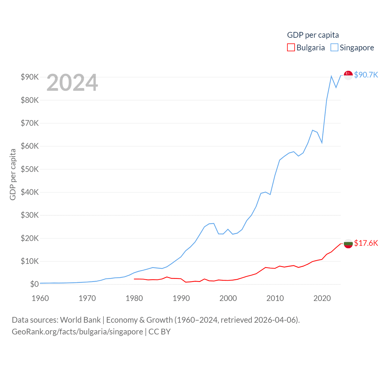 By GDP, Bulgaria ranks 67/197 ($113B) and Singapore ranks 28/197 ($547B). By GDP per capita, Bulgaria ranks 64/197 ($17,596), while Singapore ranks 7/197 ($90,674).