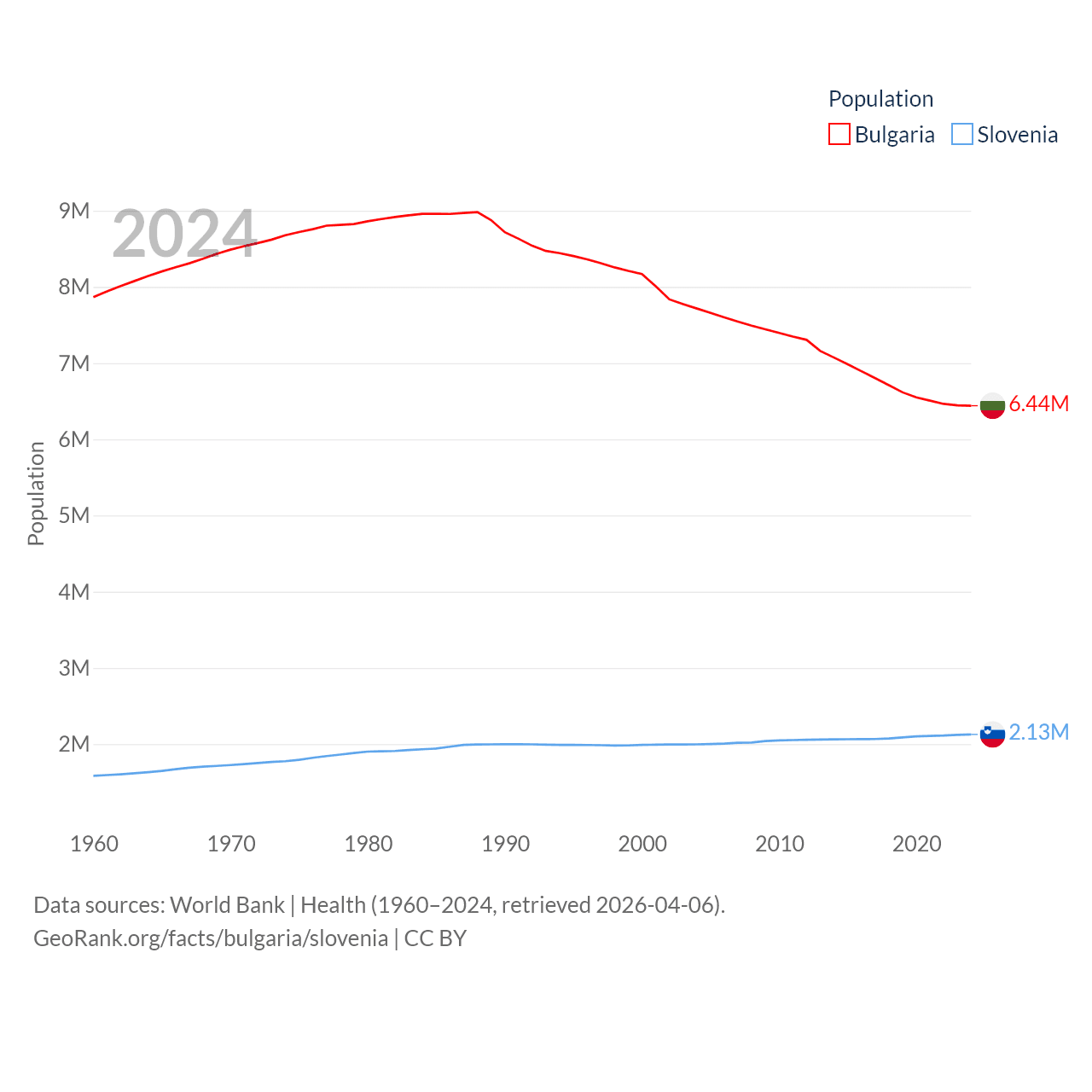 Bulgaria has a population of 6.44M (ranked 110/197), compared with 2.13M in Slovenia (ranked 147/197). Bulgaria's land area is 41,915 sq mi versus 7,774 sq mi for Slovenia (ranked 101st vs. 151st).