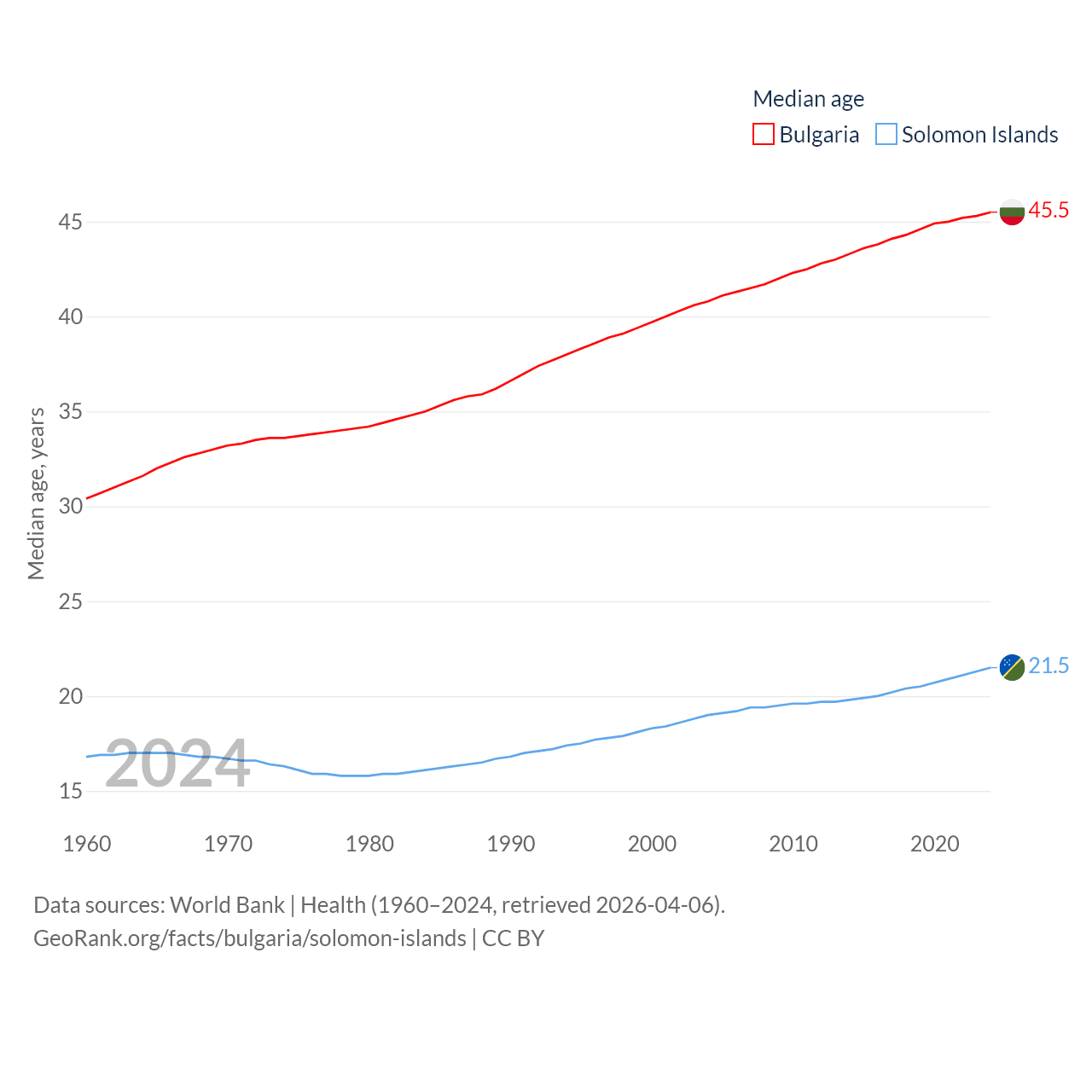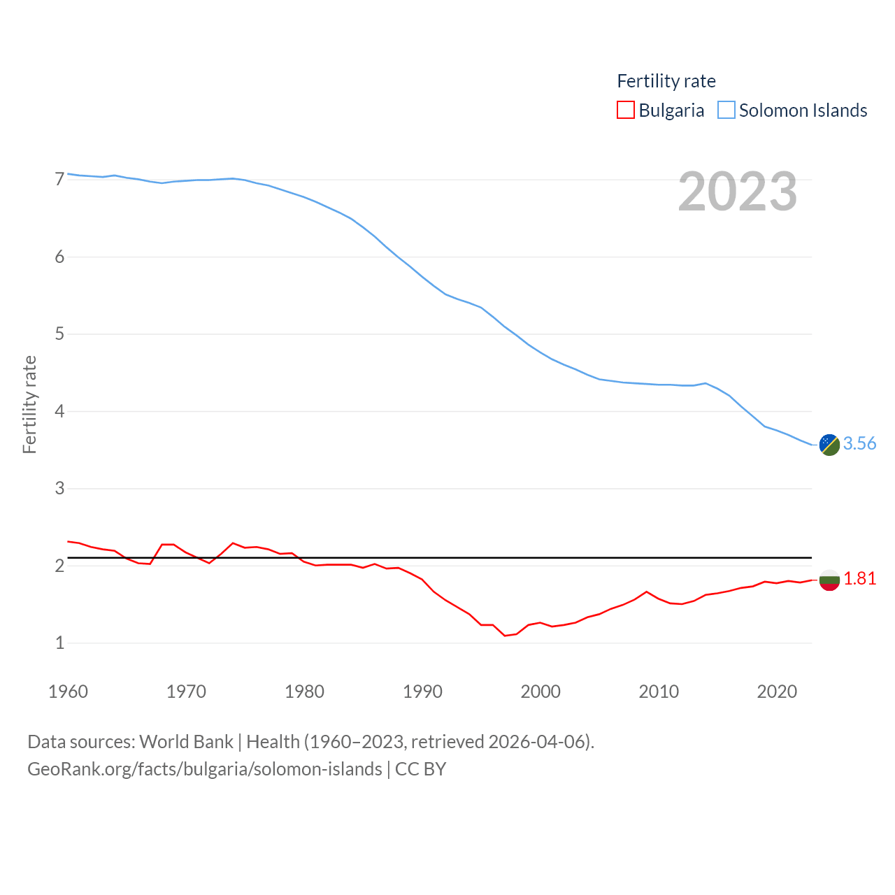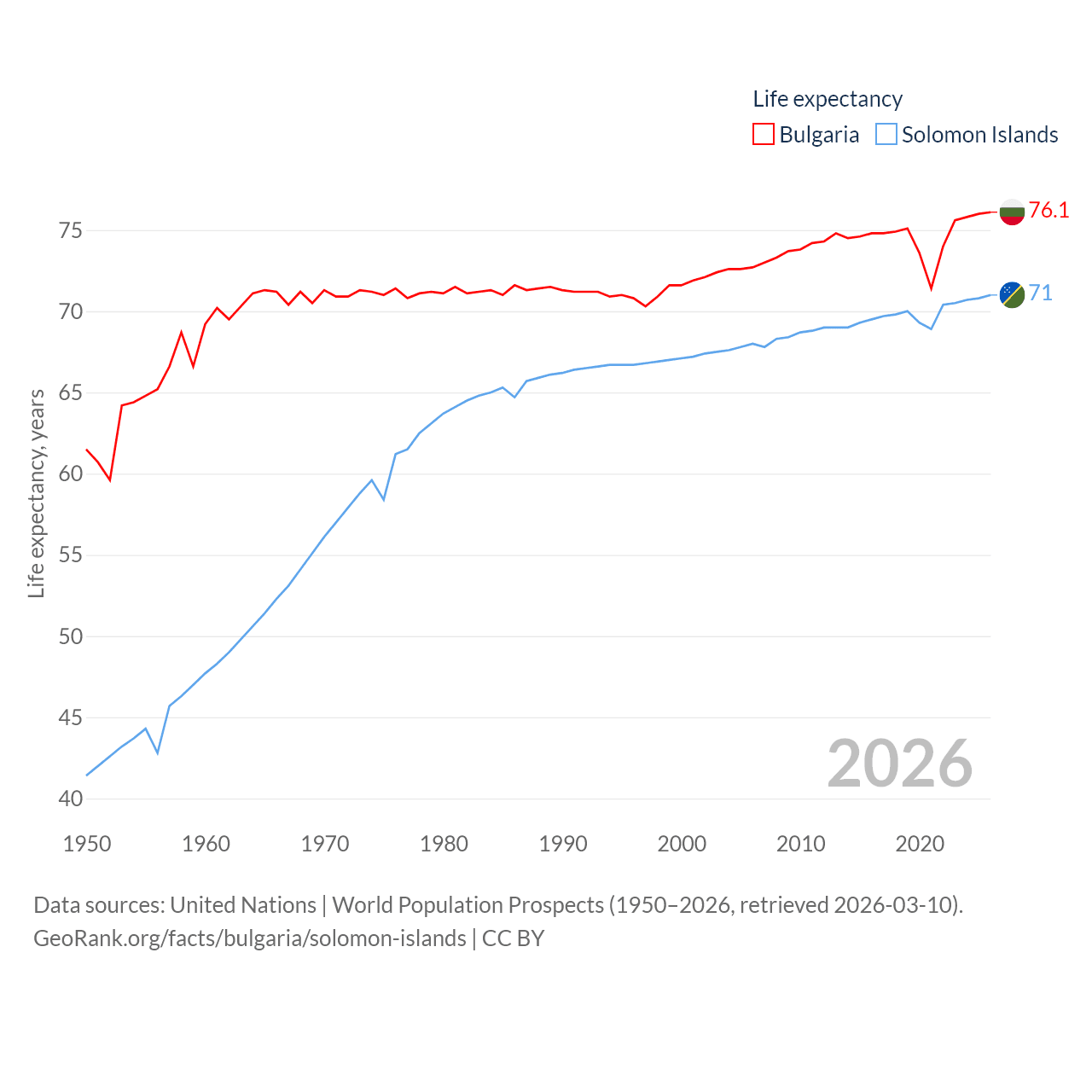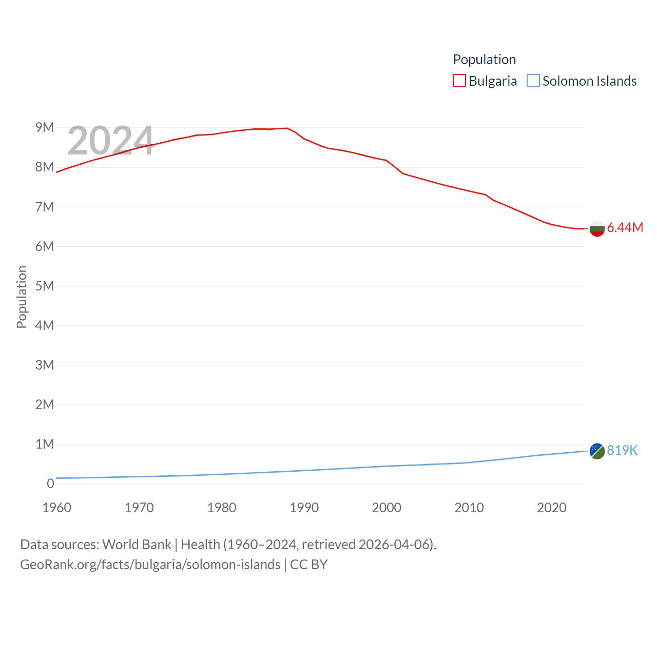 Bulgaria has a population of 6.44M (ranked 110/197), compared with 819K in The Solomon Islands (ranked 162/197). Bulgaria's land area is 41,915 sq mi versus 10,807 sq mi for The Solomon Islands (ranked 101st vs. 141st).