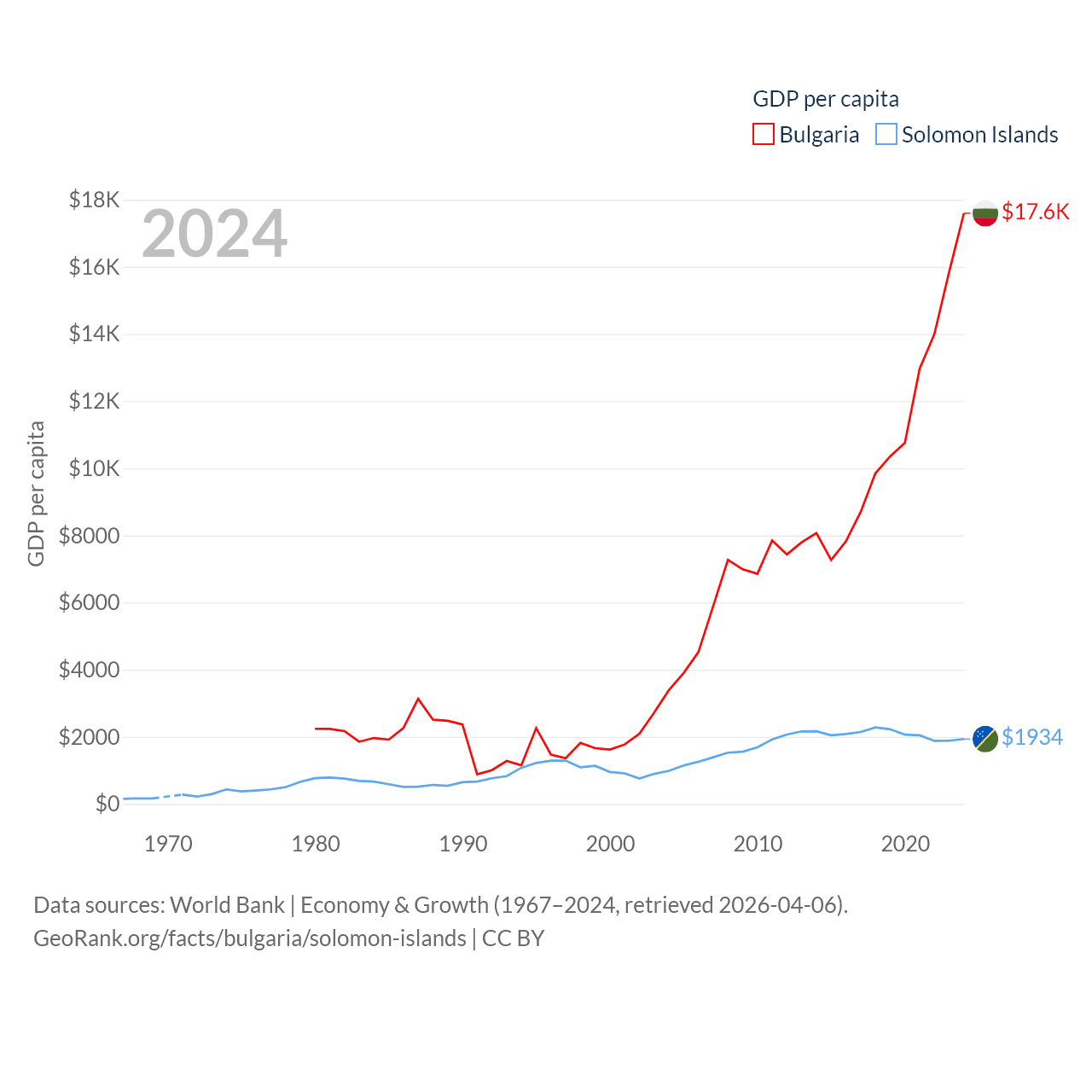 By GDP, Bulgaria ranks 67/197 ($113B) and The Solomon Islands ranks 182/197 ($1.58B). By GDP per capita, Bulgaria ranks 64/197 ($17,596), while The Solomon Islands ranks 157/197 ($1,934).