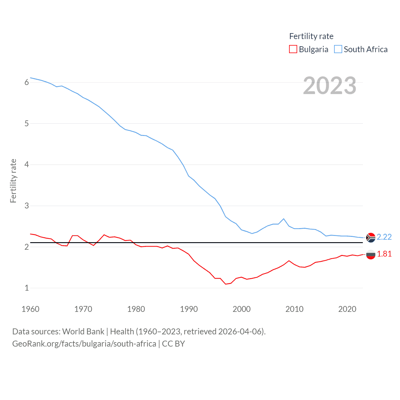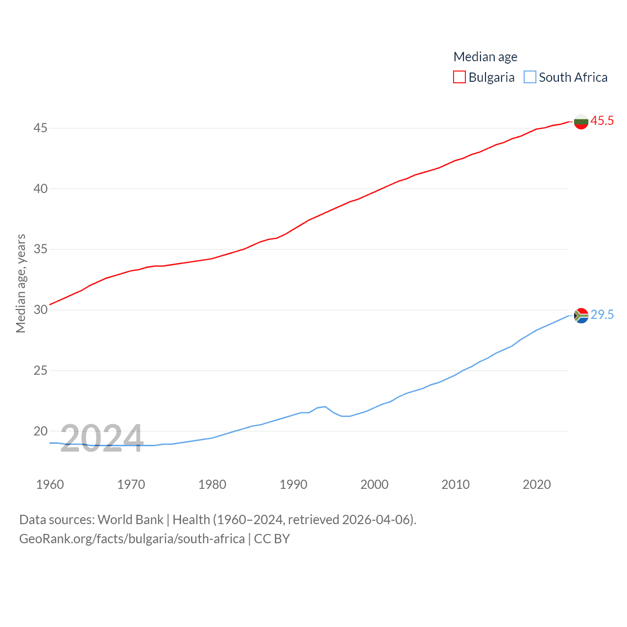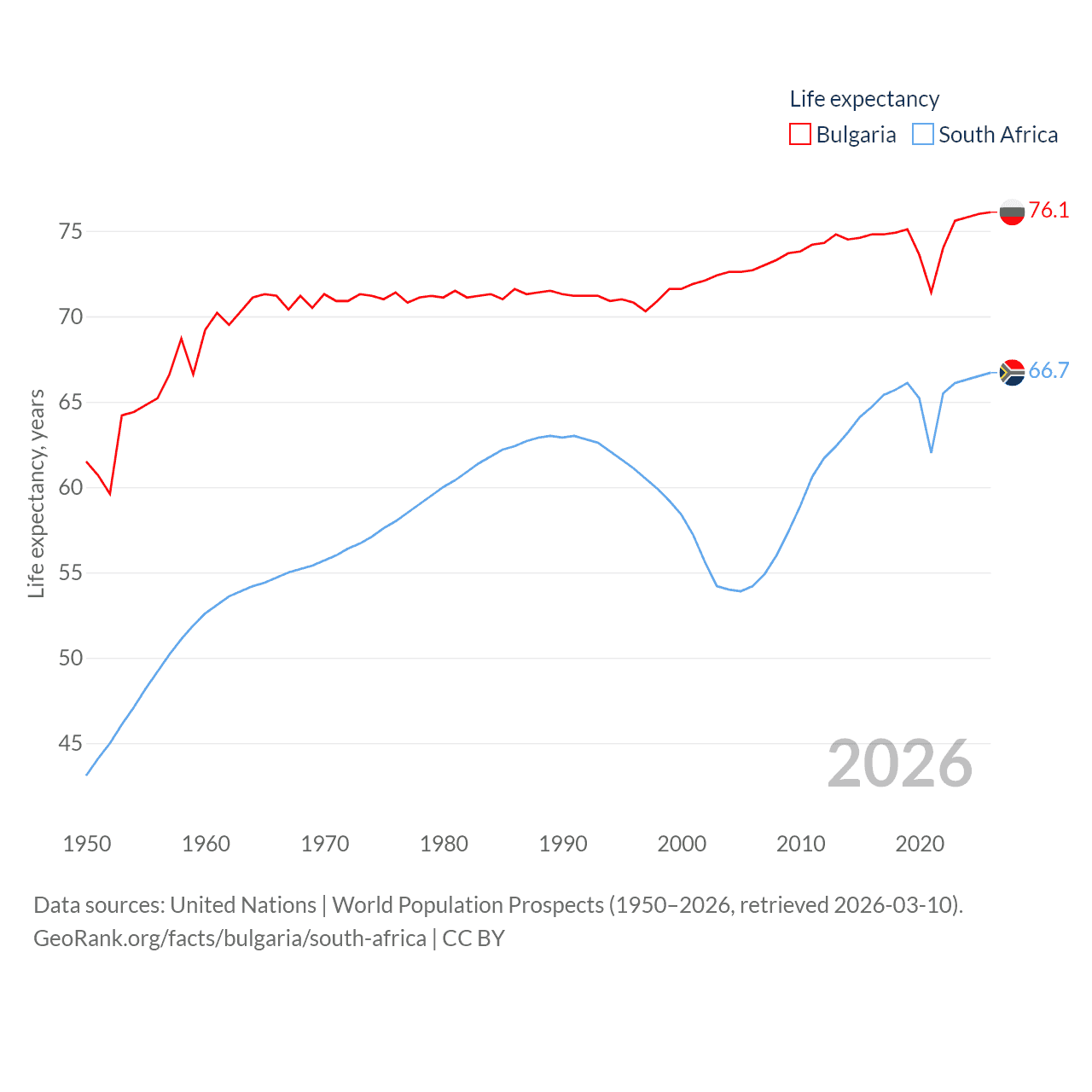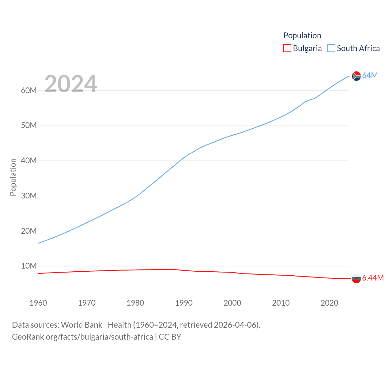 Bulgaria has a population of 6.44M (ranked 110/197), compared with 64M in South Africa (ranked 24/197). Bulgaria's land area is 41,915 sq mi versus 468,377 sq mi for South Africa (ranked 101st vs. 24th).