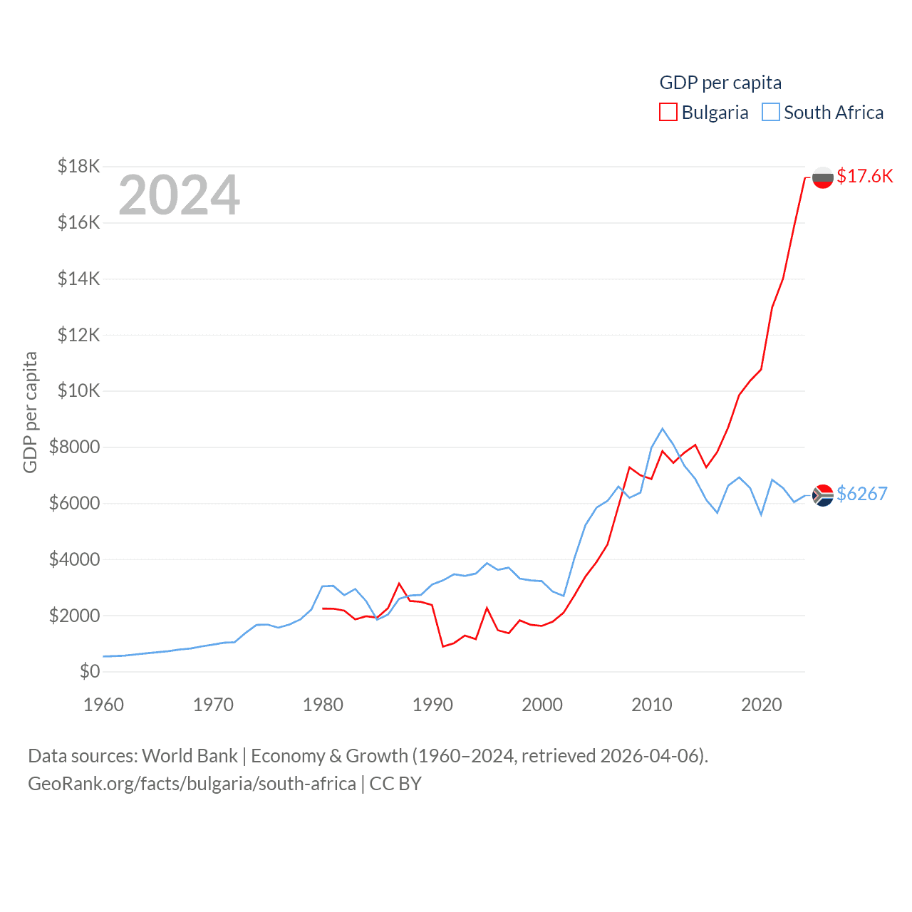 By GDP, Bulgaria ranks 67/197 ($113B) and South Africa ranks 40/197 ($401B). By GDP per capita, Bulgaria ranks 64/197 ($17,596), while South Africa ranks 111/197 ($6,267).