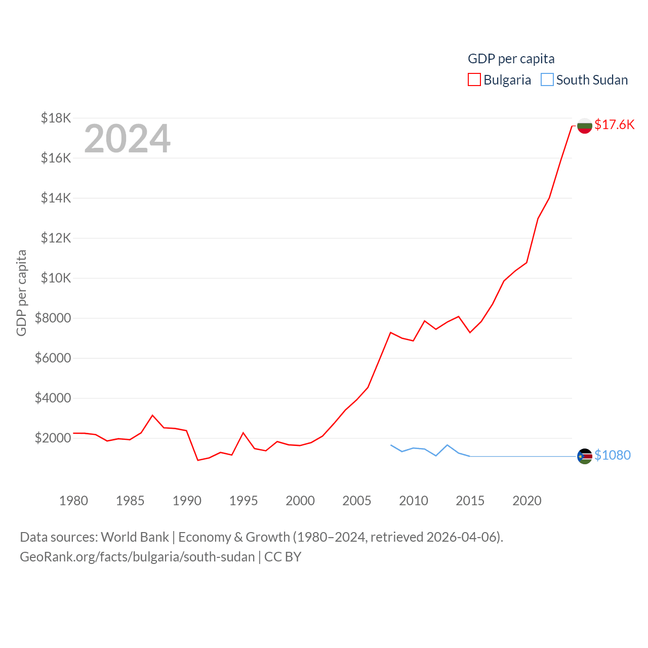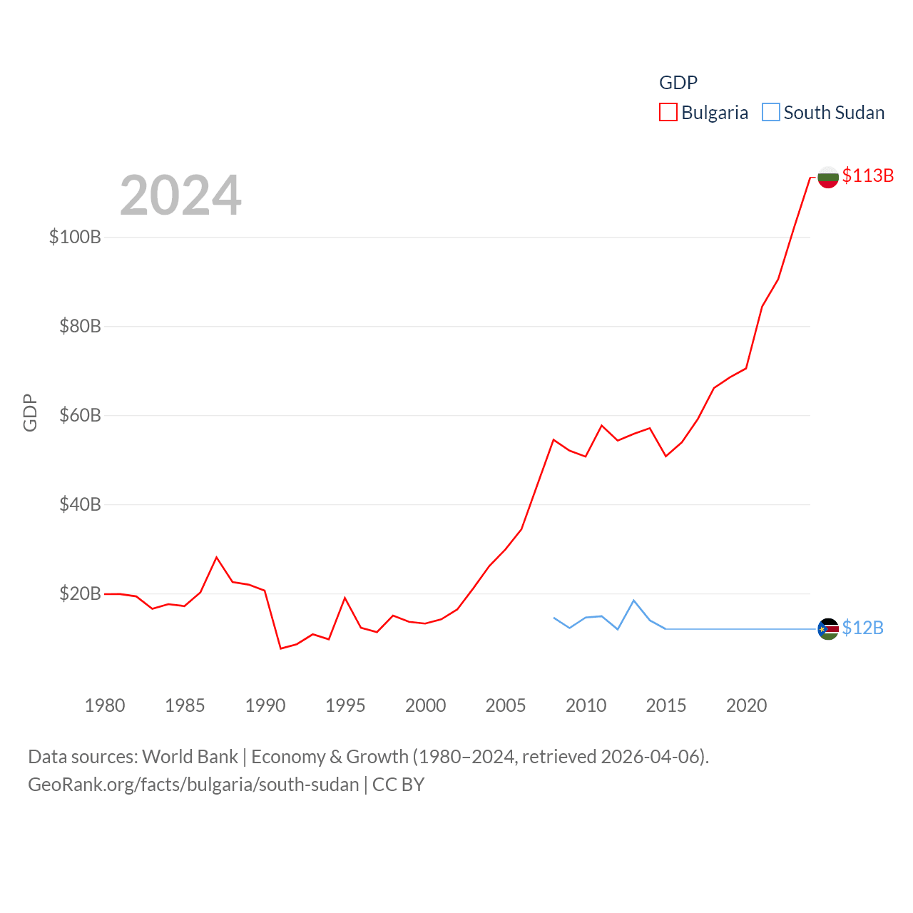 By GDP, Bulgaria ranks 67/197 ($113B) and South Sudan ranks 149/197 ($12B). By GDP per capita, Bulgaria ranks 64/197 ($17,596), while South Sudan ranks 175/197 ($1,080).