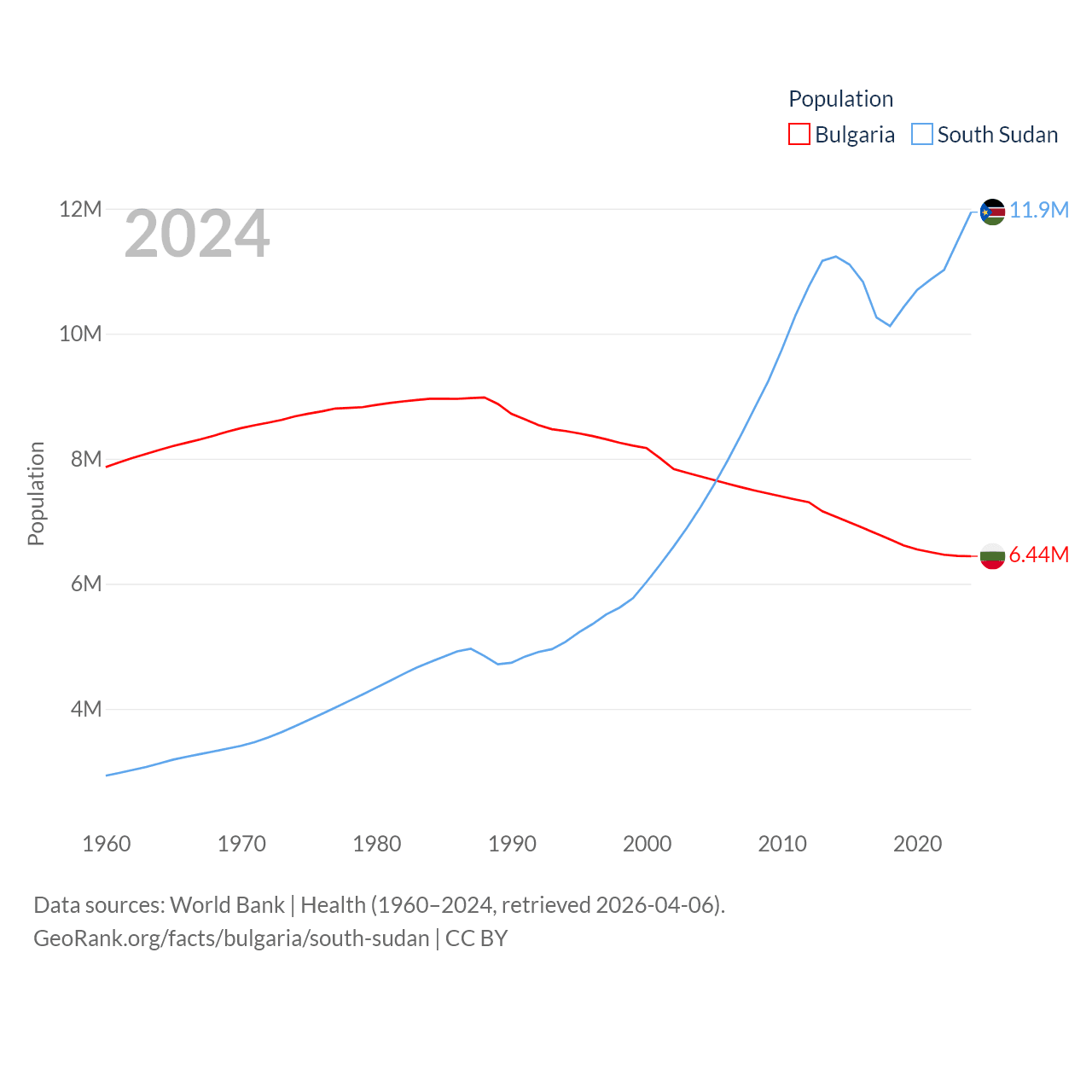 Bulgaria has a population of 6.44M (ranked 110/197), compared with 11.9M in South Sudan (ranked 81/197). Bulgaria's land area is 41,915 sq mi versus 243,990 sq mi for South Sudan (ranked 101st vs. 41st).