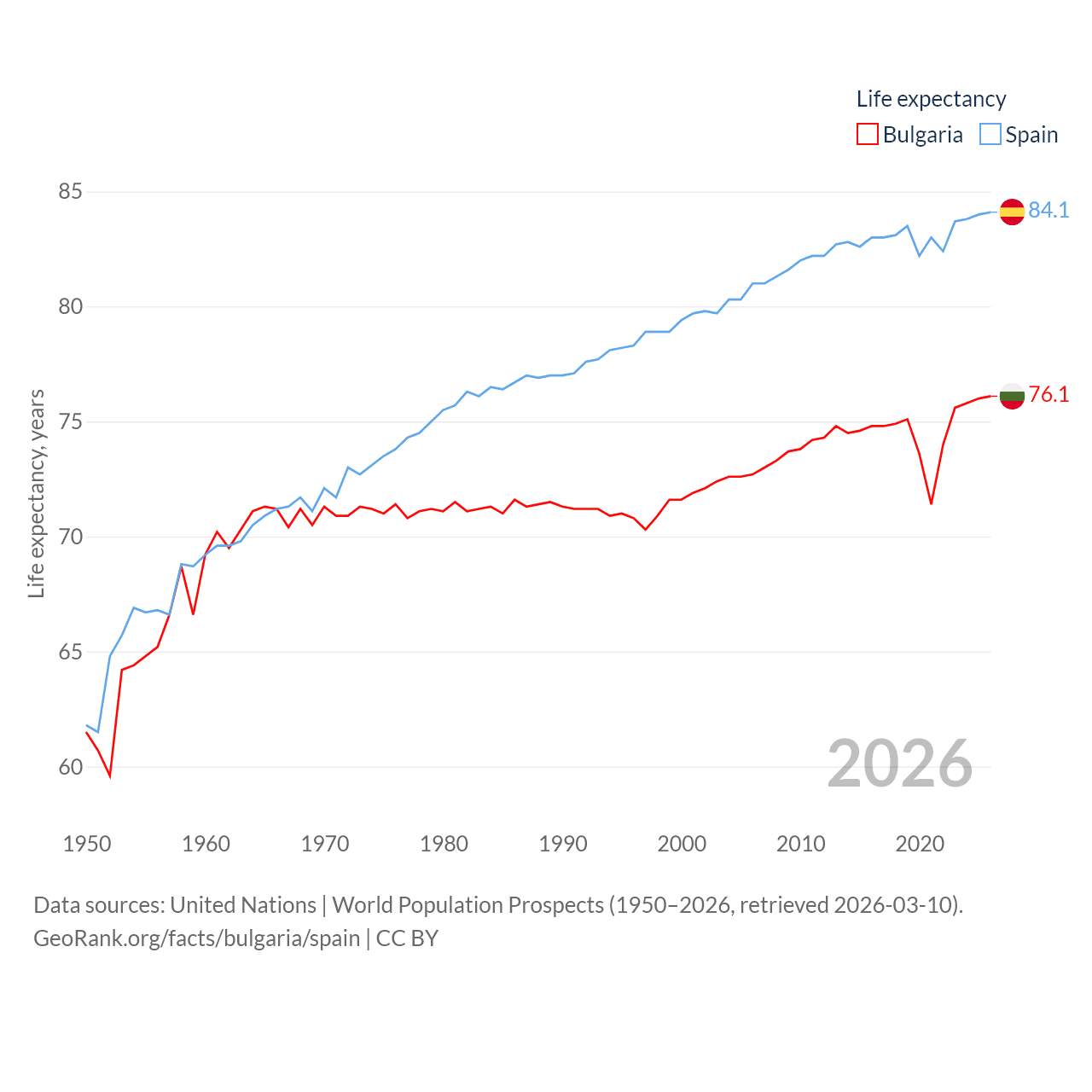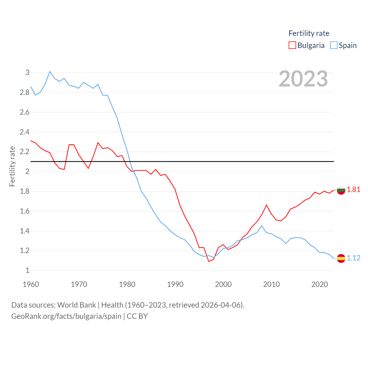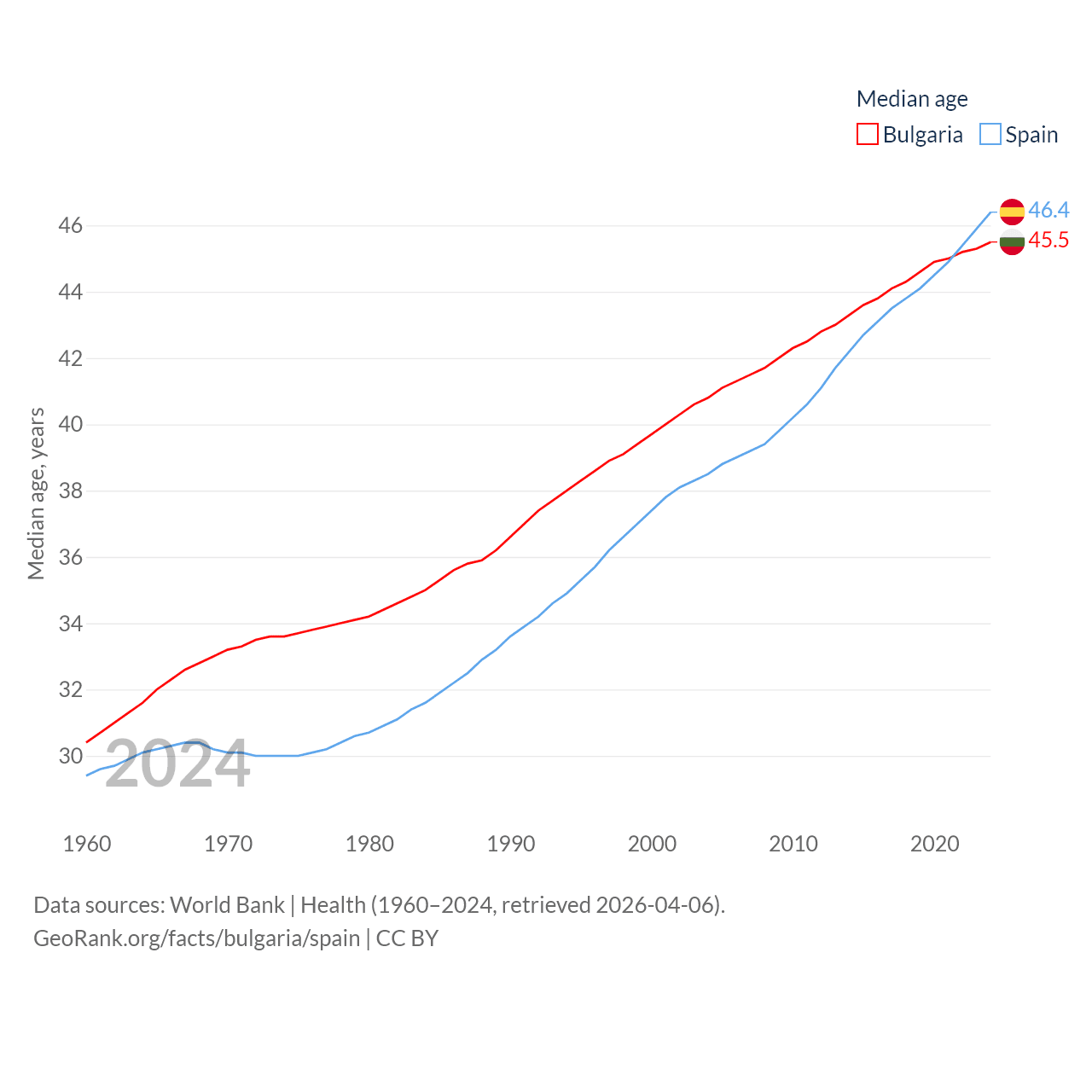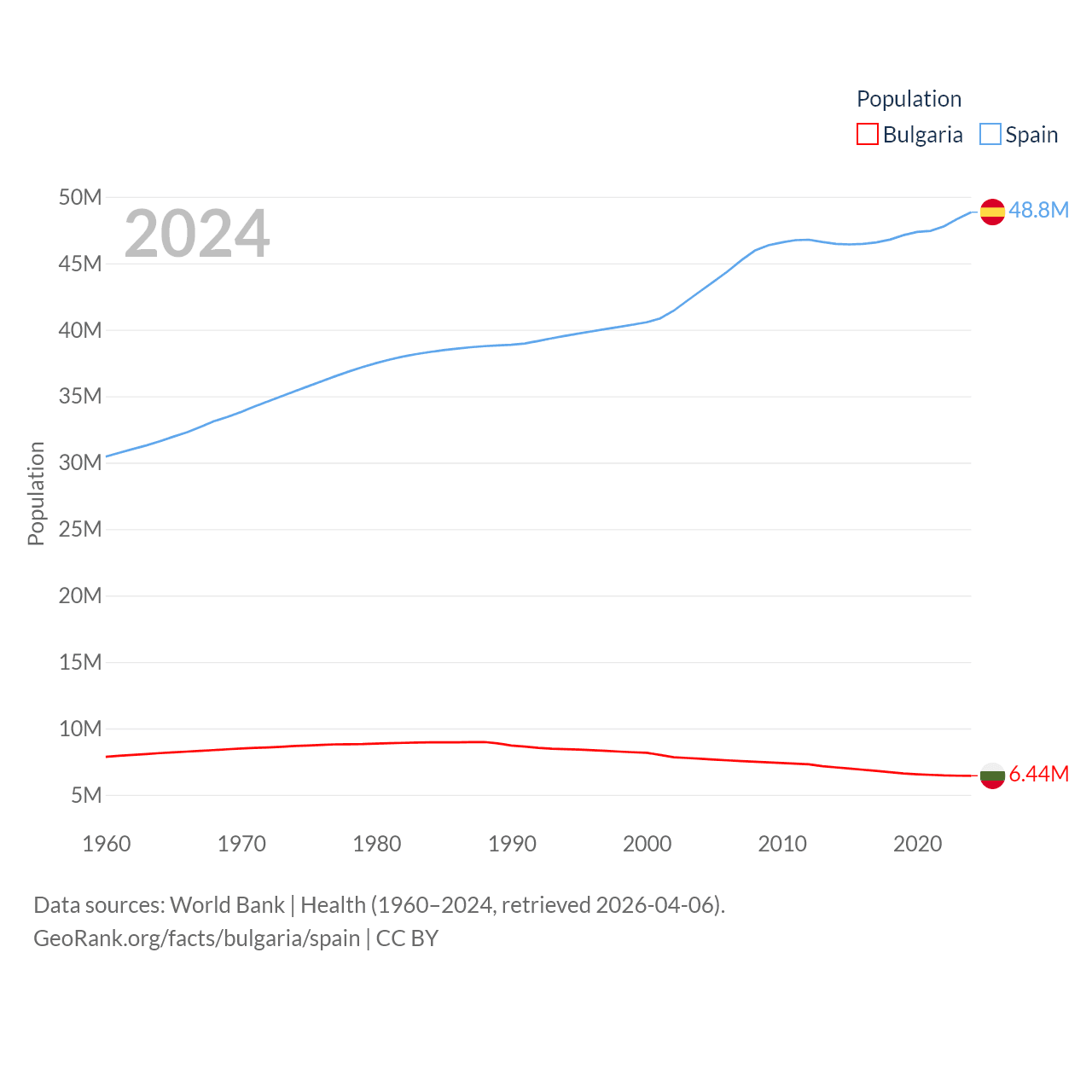 Bulgaria has a population of 6.44M (ranked 110/197), compared with 48.8M in Spain (ranked 32/197). Bulgaria's land area is 41,915 sq mi versus 192,934 sq mi for Spain (ranked 101st vs. 51st).