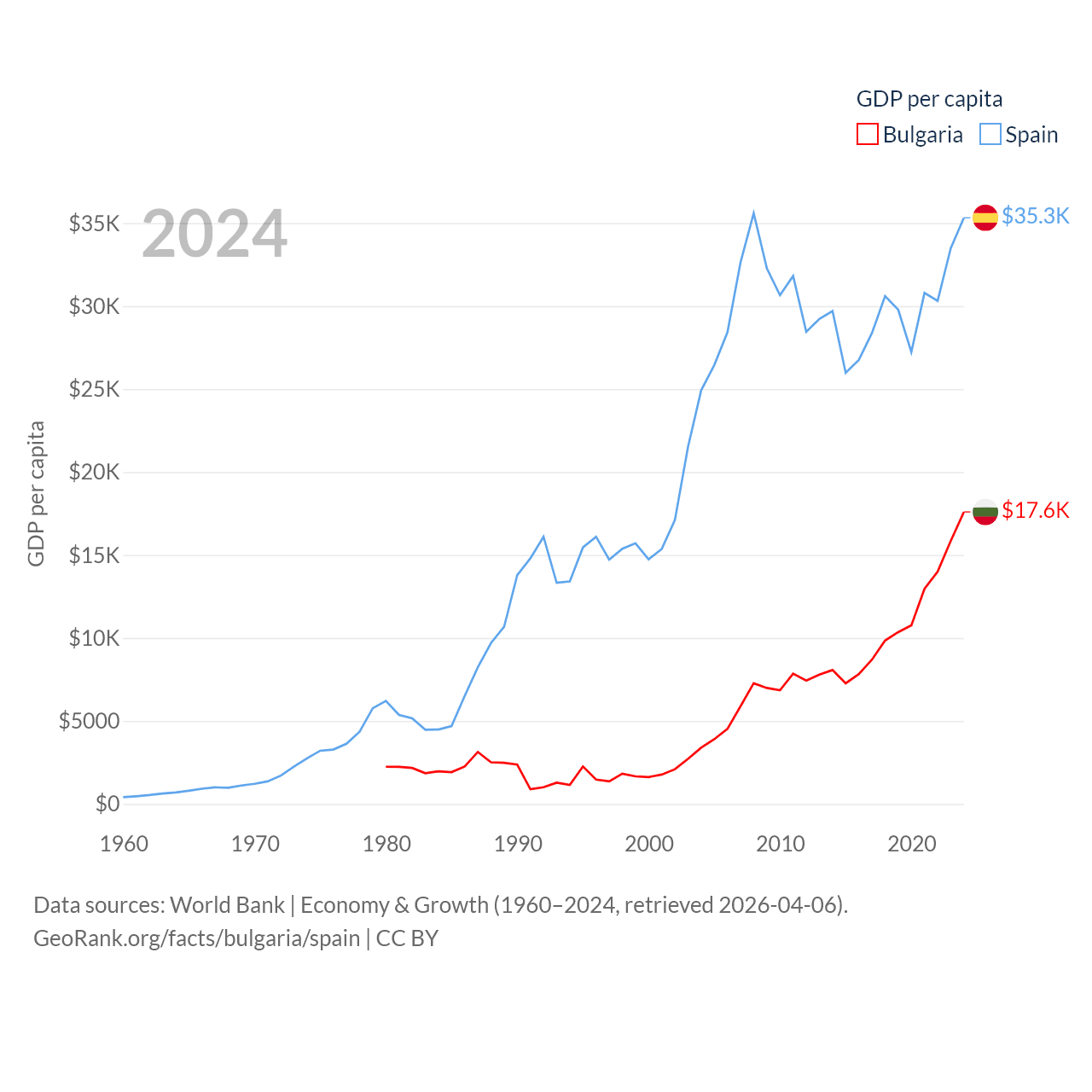 By GDP, Bulgaria ranks 67/197 ($113B) and Spain ranks 15/197 ($1.73T). By GDP per capita, Bulgaria ranks 64/197 ($17,596), while Spain ranks 32/197 ($35,327).