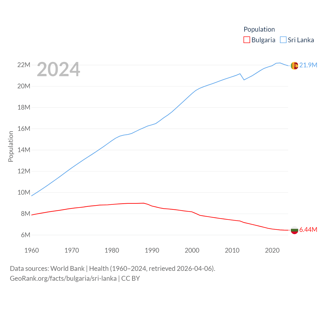 Bulgaria has a population of 6.44M (ranked 110/197), compared with 21.9M in Sri Lanka (ranked 61/197). Bulgaria's land area is 41,915 sq mi versus 23,884 sq mi for Sri Lanka (ranked 101st vs. 122nd).