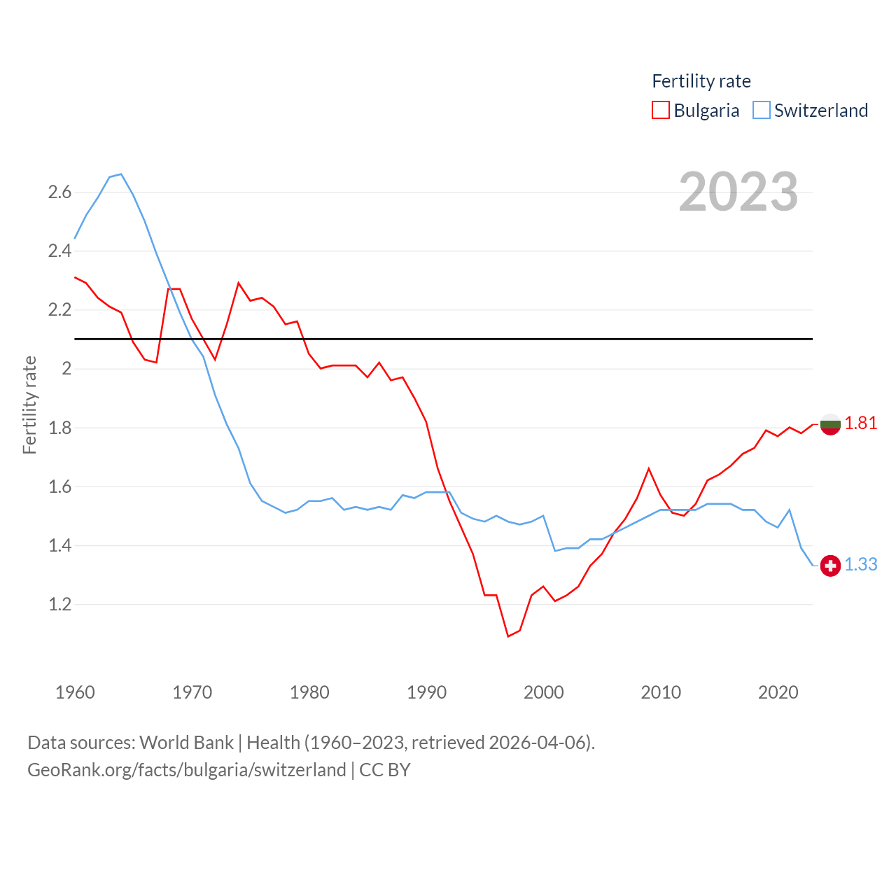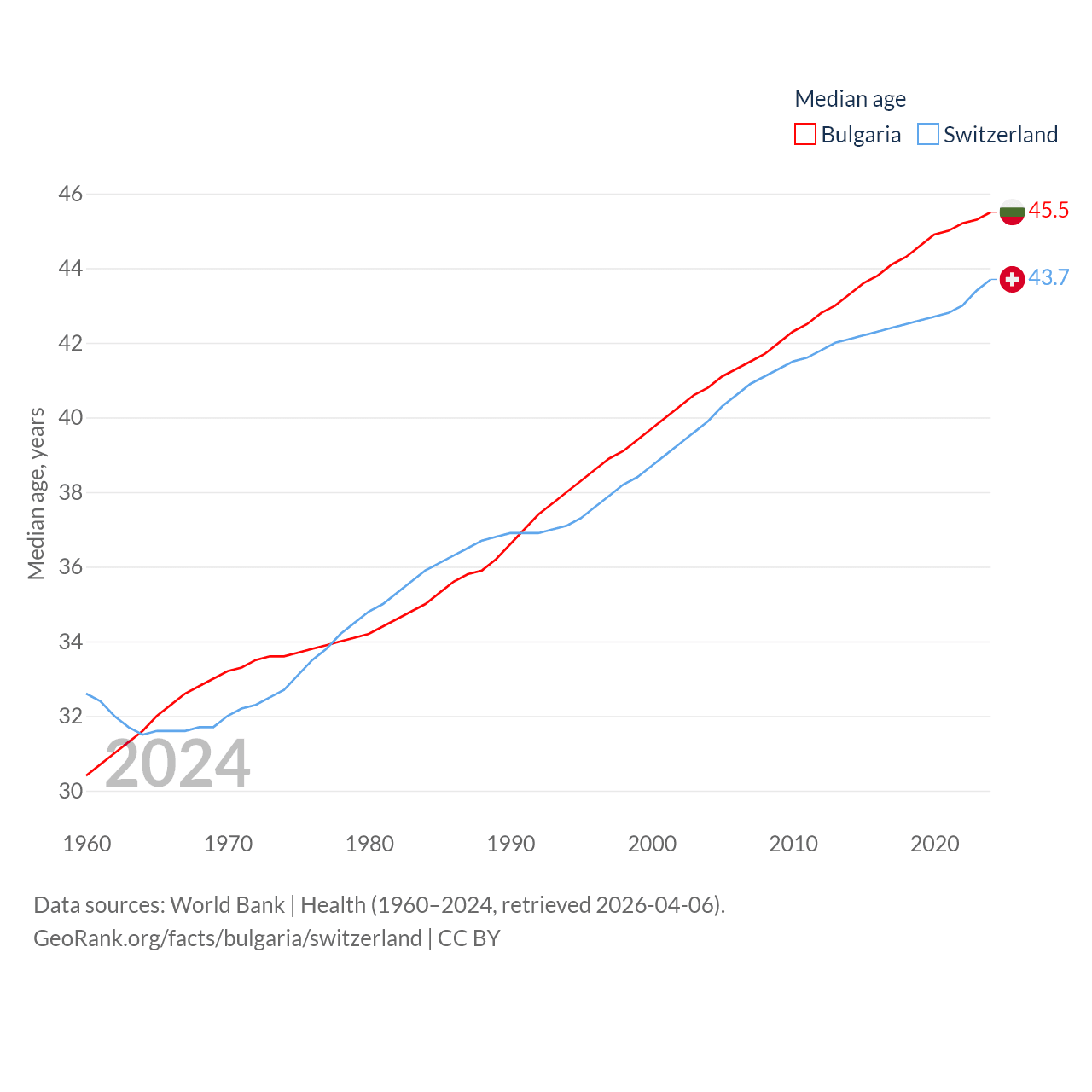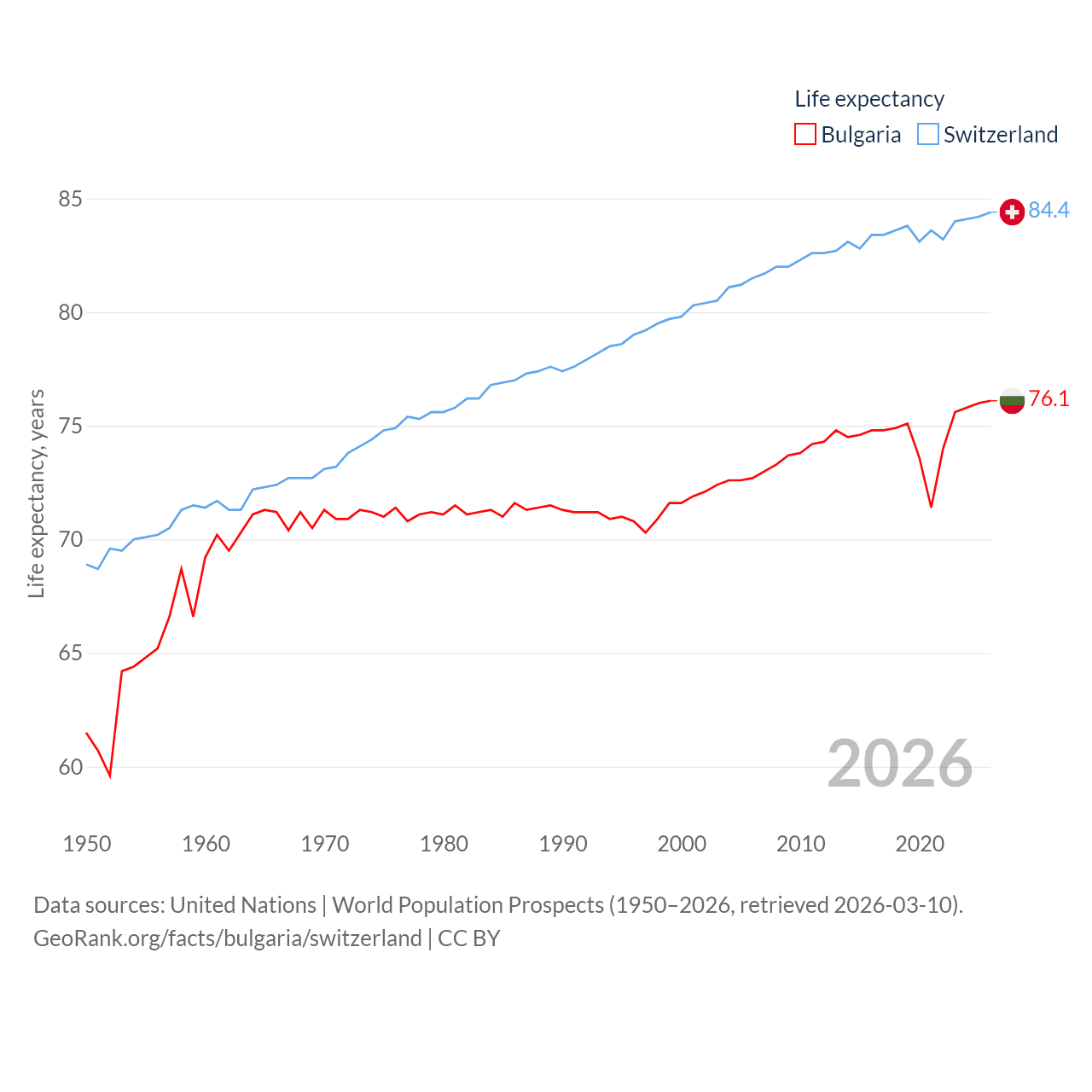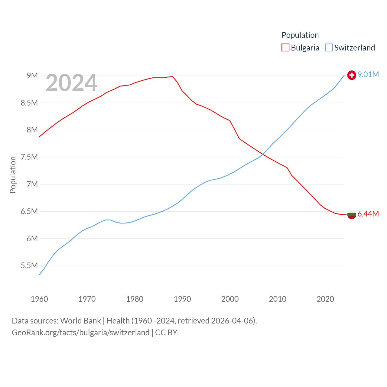 Bulgaria has a population of 6.44M (ranked 110/197), compared with 9.01M in Switzerland (ranked 101/197). Bulgaria's land area is 41,915 sq mi versus 15,255 sq mi for Switzerland (ranked 101st vs. 131st).