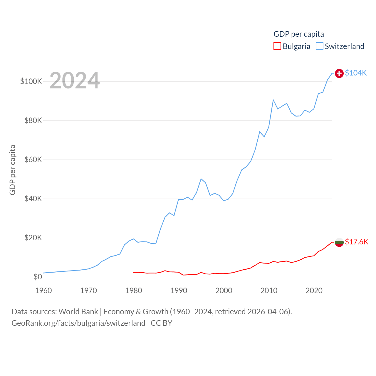 By GDP, Bulgaria ranks 67/197 ($113B) and Switzerland ranks 20/197 ($937B). By GDP per capita, Bulgaria ranks 64/197 ($17,596), while Switzerland ranks 5/197 ($103,998).