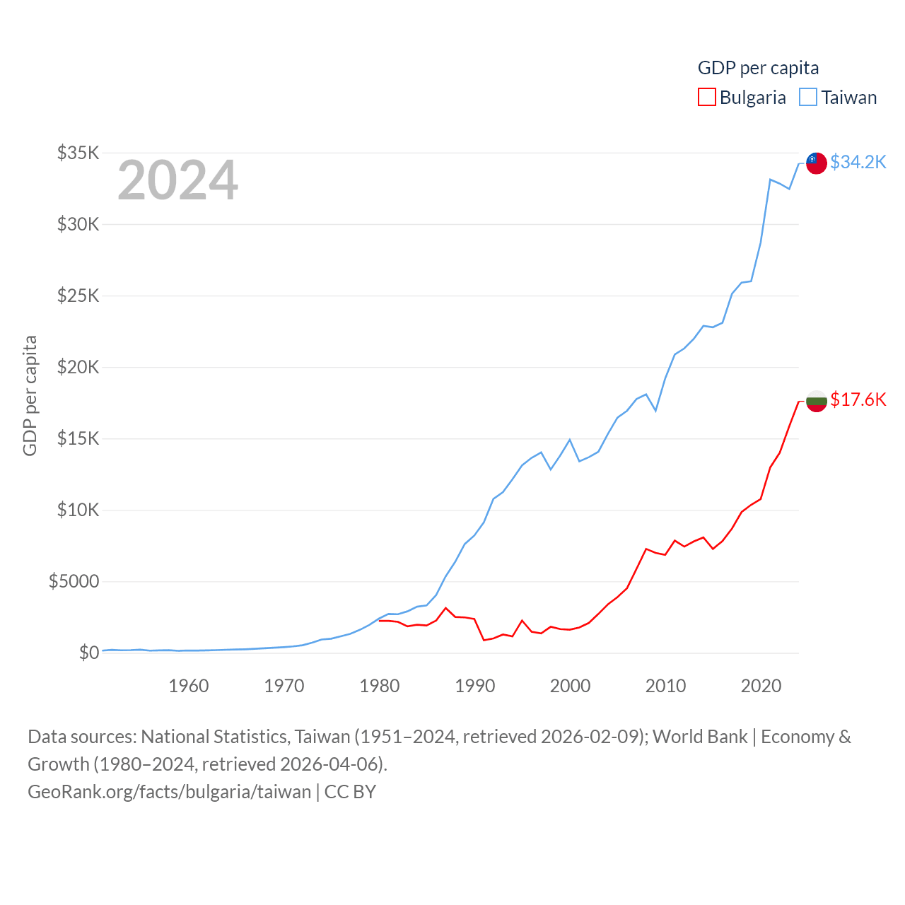 By GDP, Bulgaria ranks 67/197 ($113B) and Taiwan ranks 22/197 ($802B). By GDP per capita, Bulgaria ranks 64/197 ($17,596), while Taiwan ranks 35/197 ($34,238).