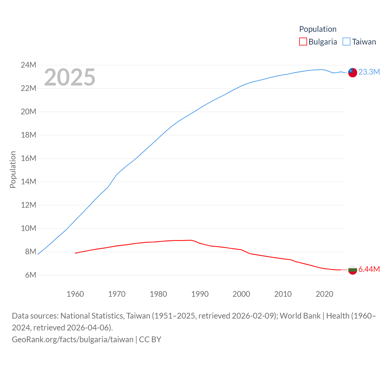 Bulgaria has a population of 6.44M (ranked 110/197), compared with 23.3M in Taiwan (ranked 60/197). Bulgaria's land area is 41,915 sq mi versus 13,976 sq mi for Taiwan (ranked 101st vs. 133rd).