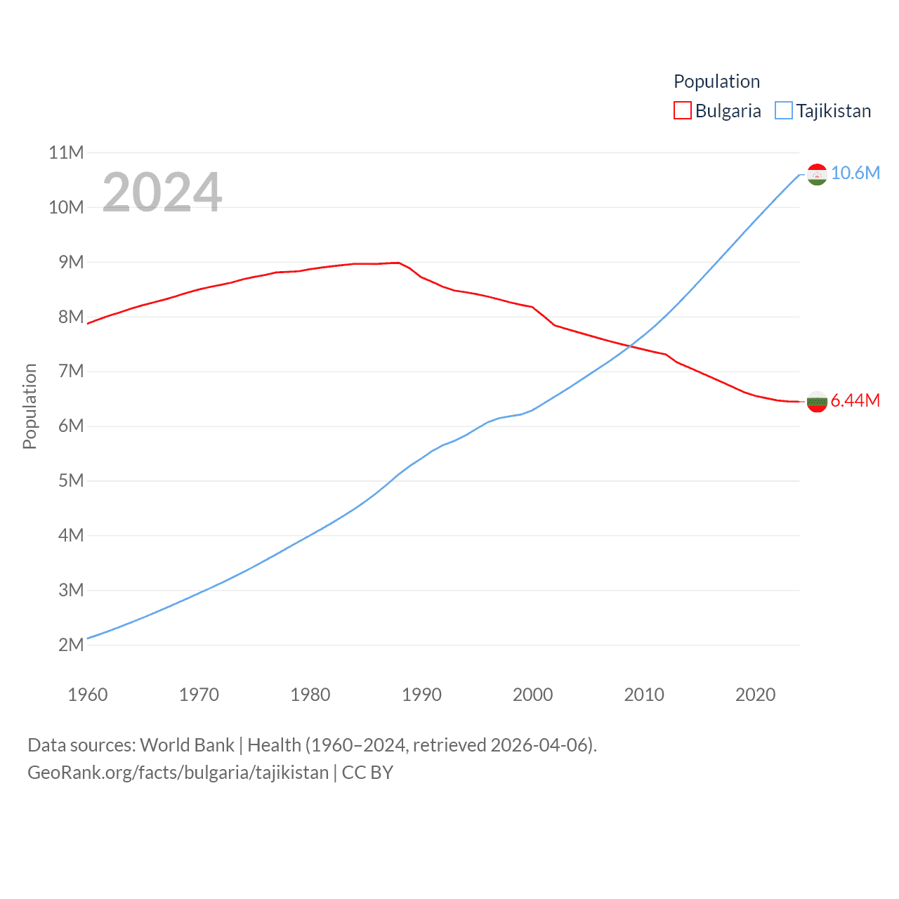 Bulgaria has a population of 6.44M (ranked 110/197), compared with 10.6M in Tajikistan (ranked 91/197). Bulgaria's land area is 41,915 sq mi versus 53,587 sq mi for Tajikistan (ranked 101st vs. 93rd).