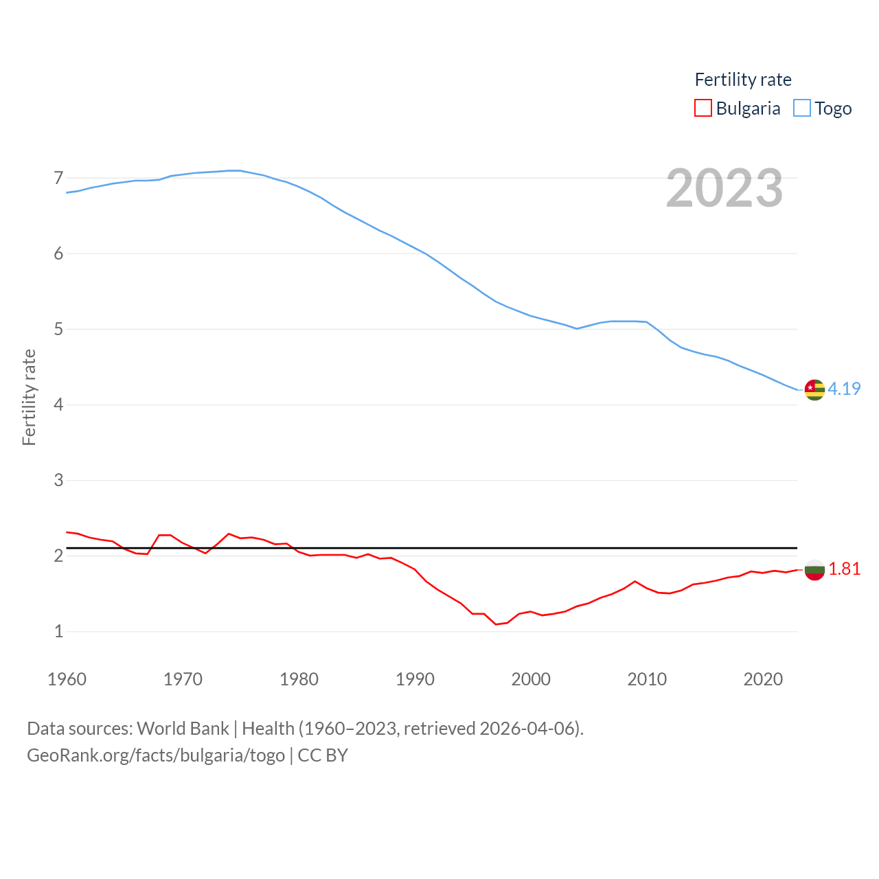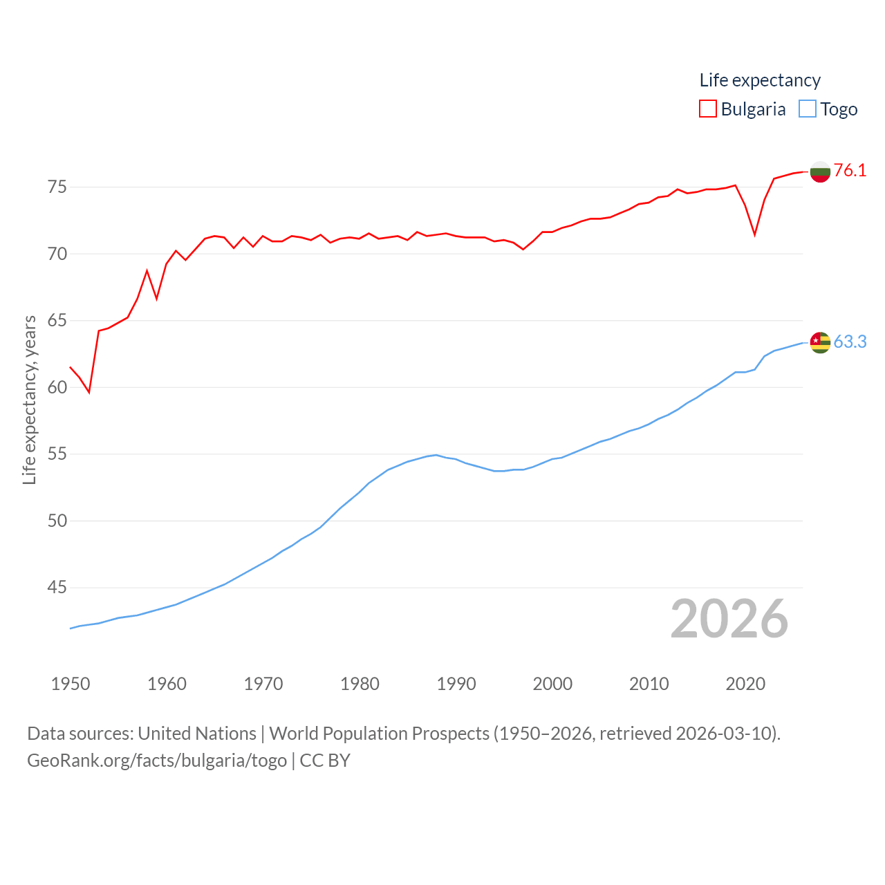 Bulgaria has a population of 6.44M (ranked 110/197), compared with 9.52M in Togo (ranked 98/197). Bulgaria's land area is 41,915 sq mi versus 21,000 sq mi for Togo (ranked 101st vs. 124th).