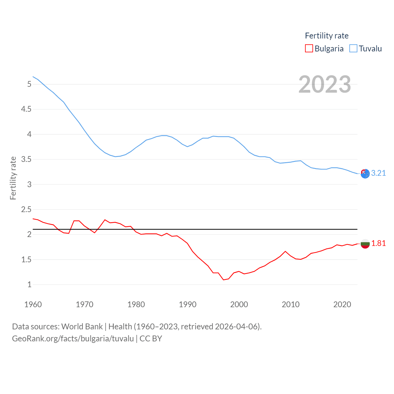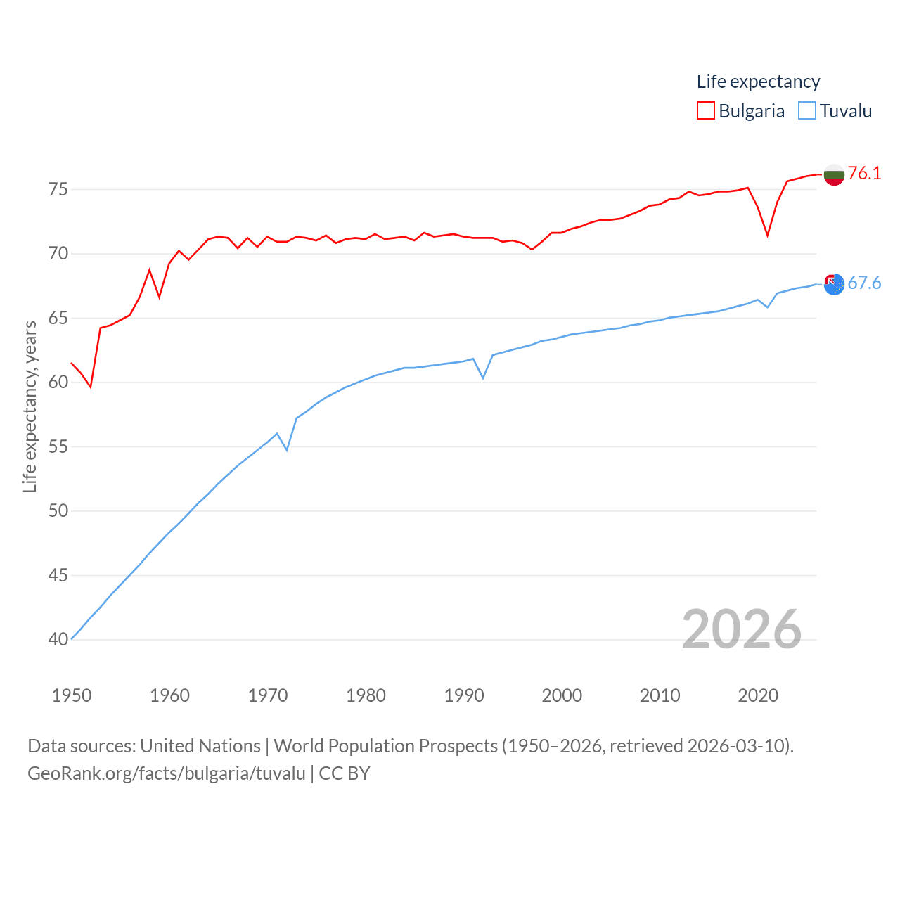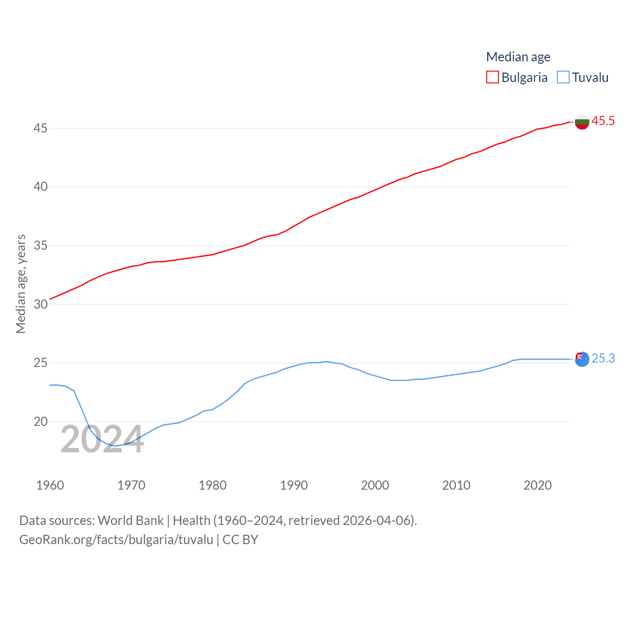 Bulgaria has a population of 6.44M (ranked 110/197), compared with 9.65K in Tuvalu (ranked 196/197). Bulgaria's land area is 41,915 sq mi versus 11.6 sq mi for Tuvalu (ranked 101st vs. 194th).