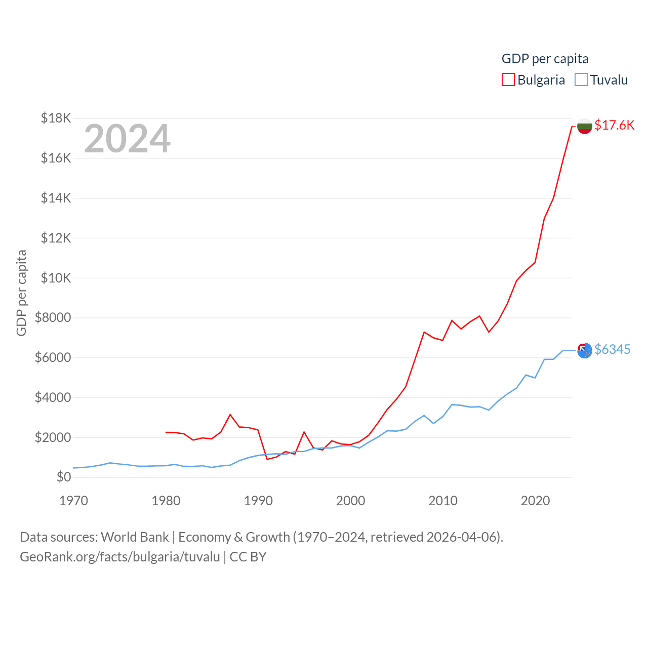 By GDP, Bulgaria ranks 67/197 ($113B) and Tuvalu ranks 196/197 ($62.3M). By GDP per capita, Bulgaria ranks 64/197 ($17,596), while Tuvalu ranks 110/197 ($6,345).