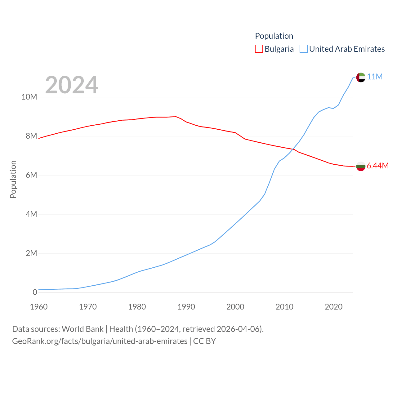 Bulgaria has a population of 6.44M (ranked 110/197), compared with 11M in The United Arab Emirates (ranked 86/197). Bulgaria's land area is 41,915 sq mi versus 27,421 sq mi for The United Arab Emirates (ranked 101st vs. 117th).
