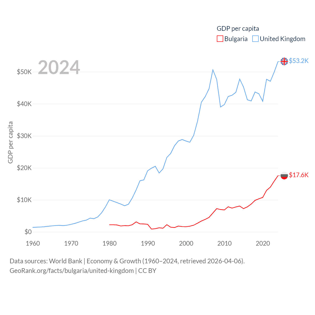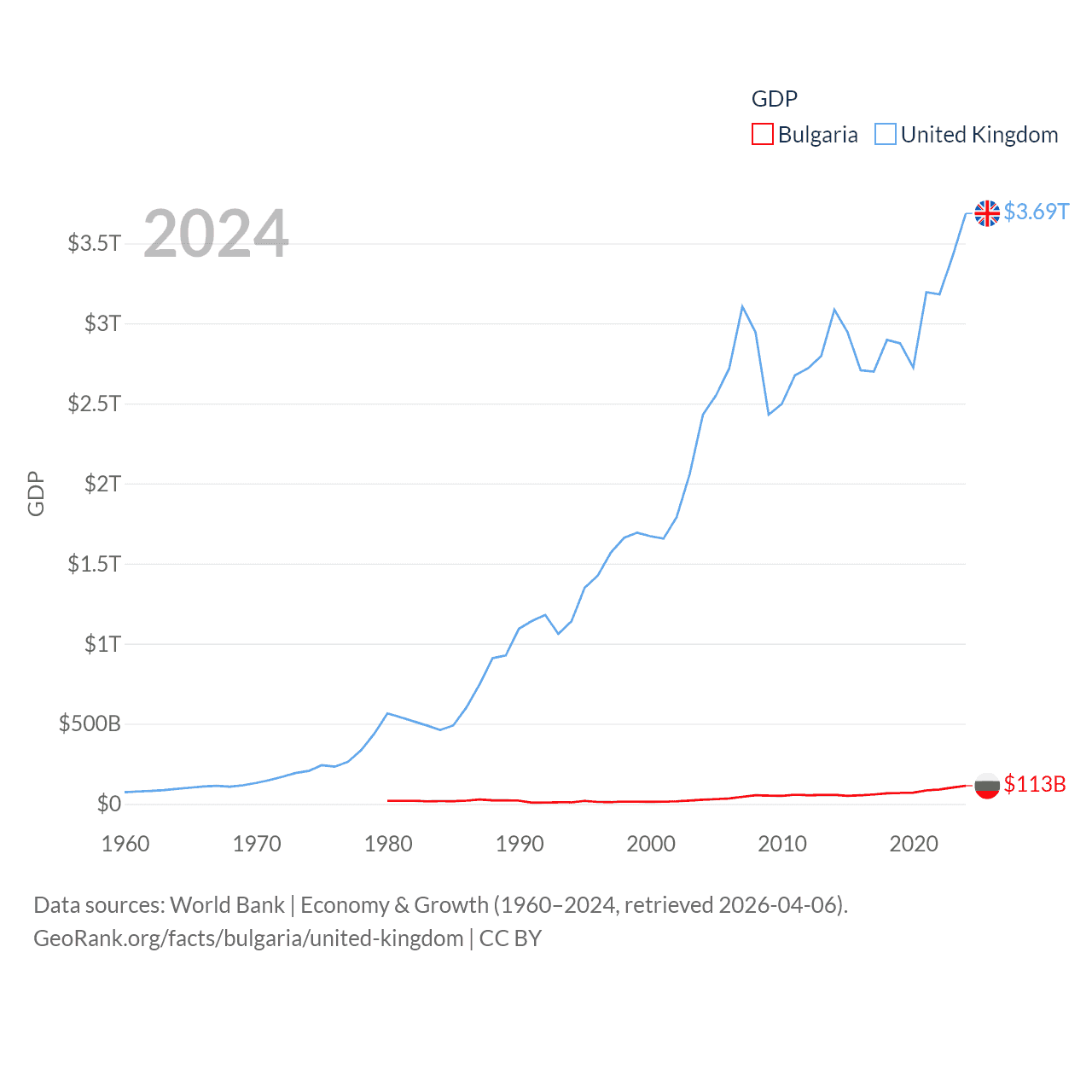 By GDP, Bulgaria ranks 67/197 ($113B) and The United Kingdom ranks 6/197 ($3.69T). By GDP per capita, Bulgaria ranks 64/197 ($17,596), while The United Kingdom ranks 22/197 ($53,246).