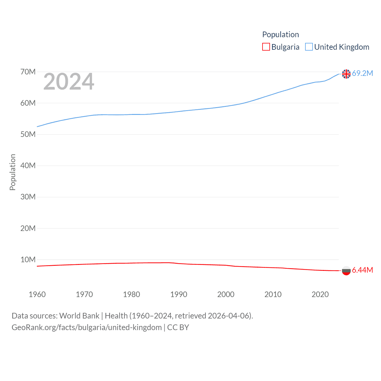 Bulgaria has a population of 6.44M (ranked 110/197), compared with 69.2M in The United Kingdom (ranked 21/197). Bulgaria's land area is 41,915 sq mi versus 93,410 sq mi for The United Kingdom (ranked 101st vs. 78th).