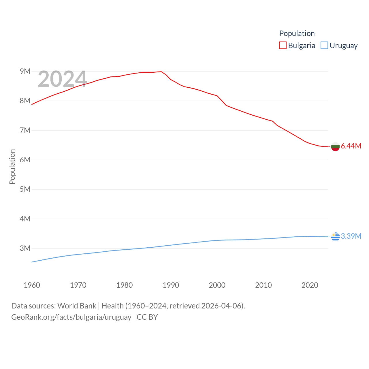 Bulgaria has a population of 6.44M (ranked 110/197), compared with 3.39M in Uruguay (ranked 133/197). Bulgaria's land area is 41,915 sq mi versus 67,576 sq mi for Uruguay (ranked 101st vs. 89th).