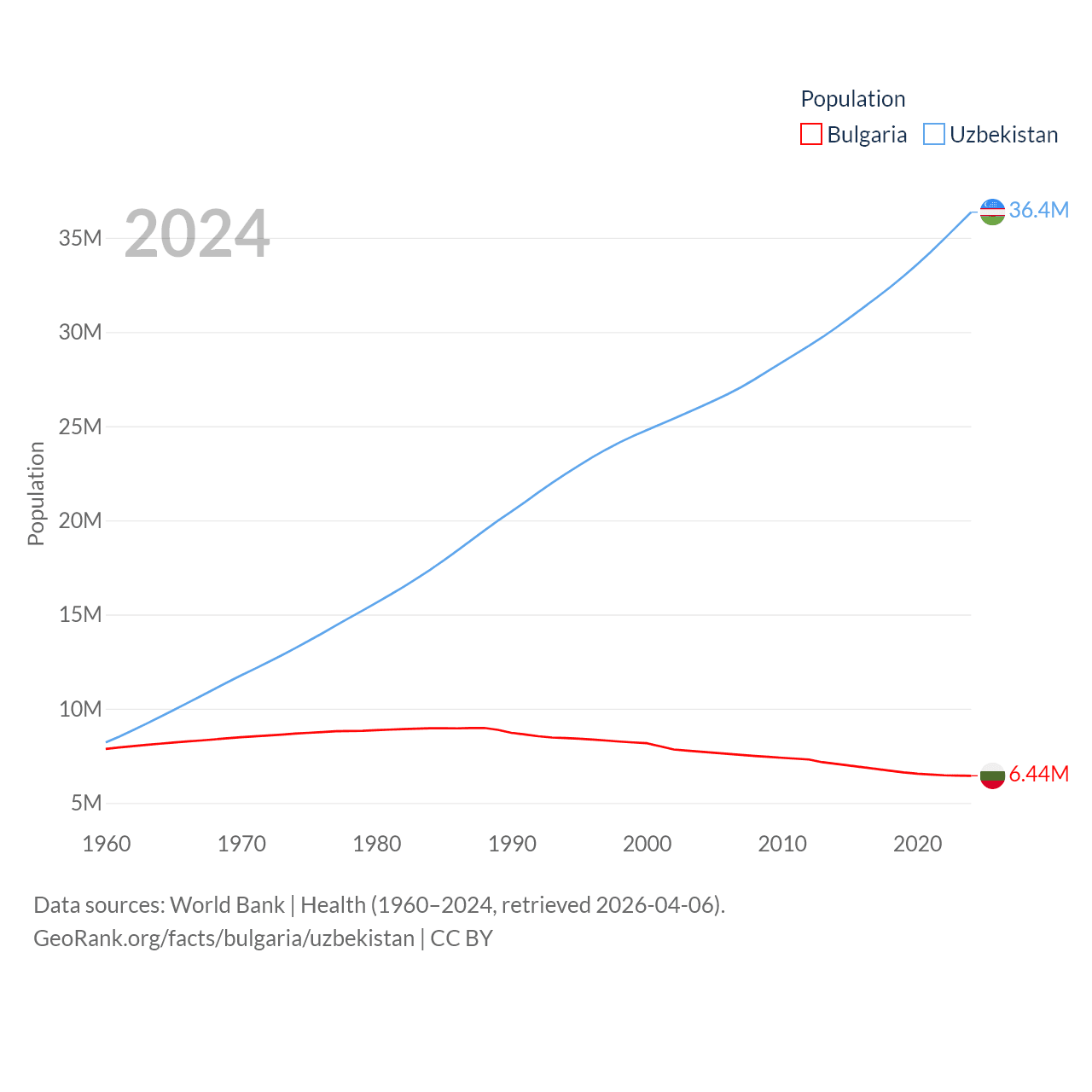 Bulgaria has a population of 6.44M (ranked 110/197), compared with 36.4M in Uzbekistan (ranked 43/197). Bulgaria's land area is 41,915 sq mi versus 170,136 sq mi for Uzbekistan (ranked 101st vs. 56th).