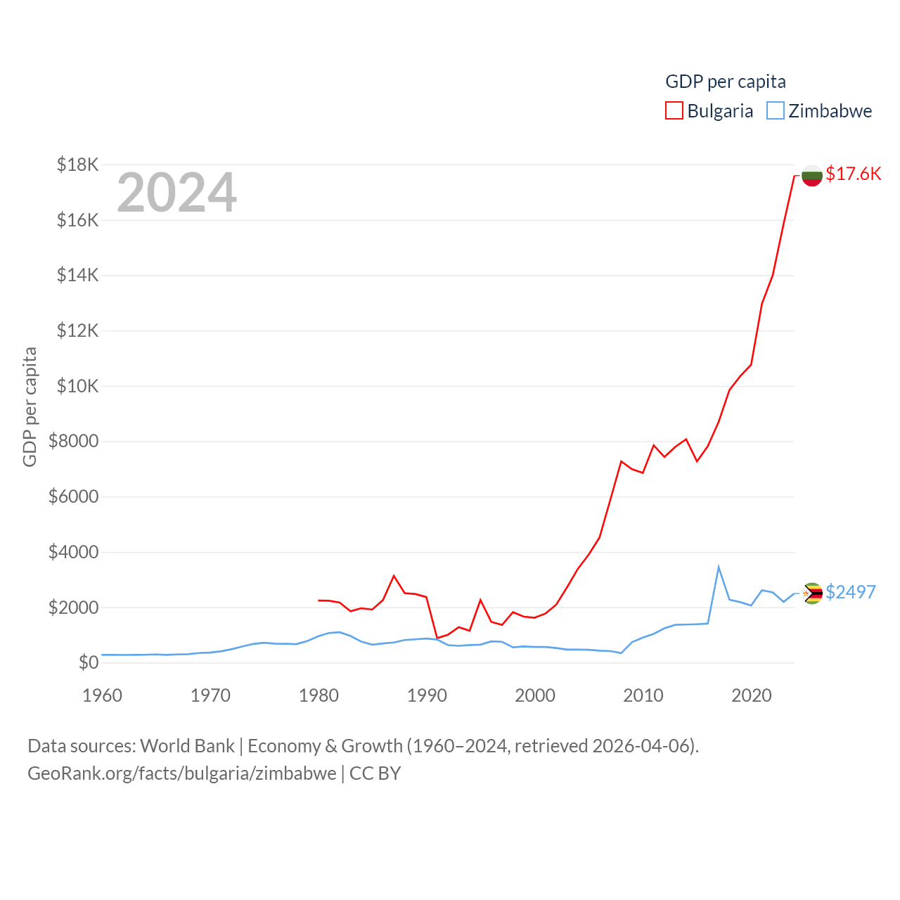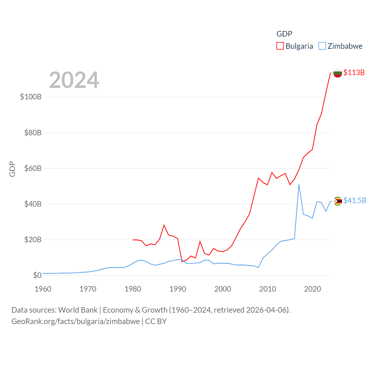 By GDP, Bulgaria ranks 67/197 ($113B) and Zimbabwe ranks 102/197 ($41.5B). By GDP per capita, Bulgaria ranks 64/197 ($17,596), while Zimbabwe ranks 148/197 ($2,497).