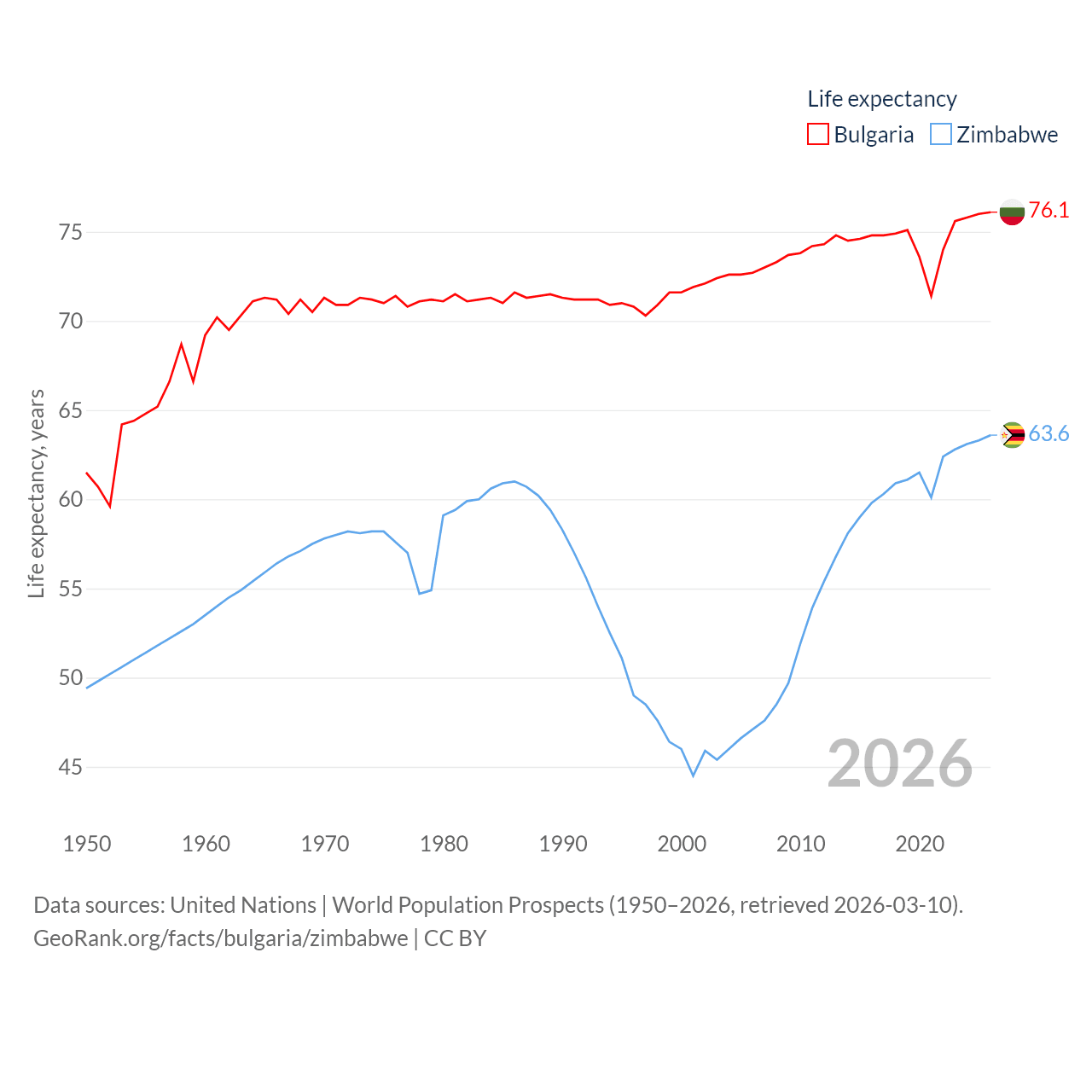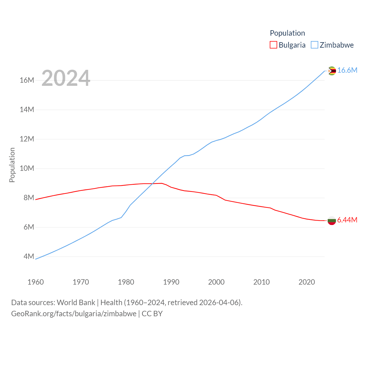 Bulgaria has a population of 6.44M (ranked 110/197), compared with 16.6M in Zimbabwe (ranked 74/197). Bulgaria's land area is 41,915 sq mi versus 149,364 sq mi for Zimbabwe (ranked 101st vs. 60th).