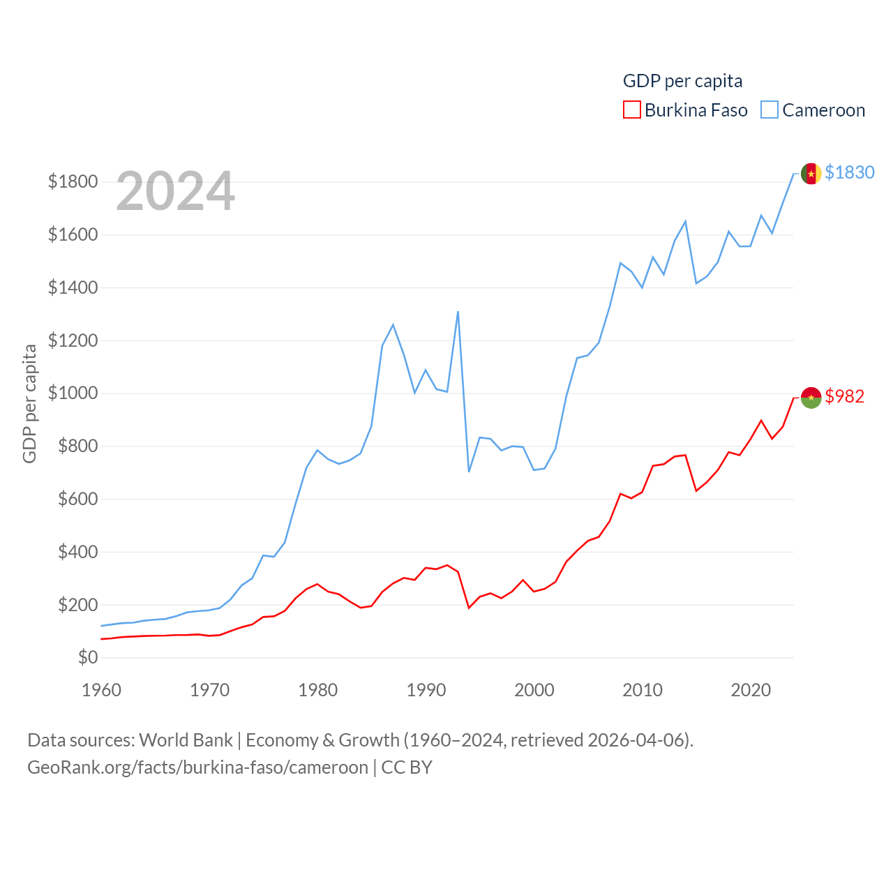 By GDP, Burkina Faso ranks 122/197 ($23.1B) and Cameroon ranks 91/197 ($53.3B). By GDP per capita, Burkina Faso ranks 180/197 ($982), while Cameroon ranks 158/197 ($1,830).