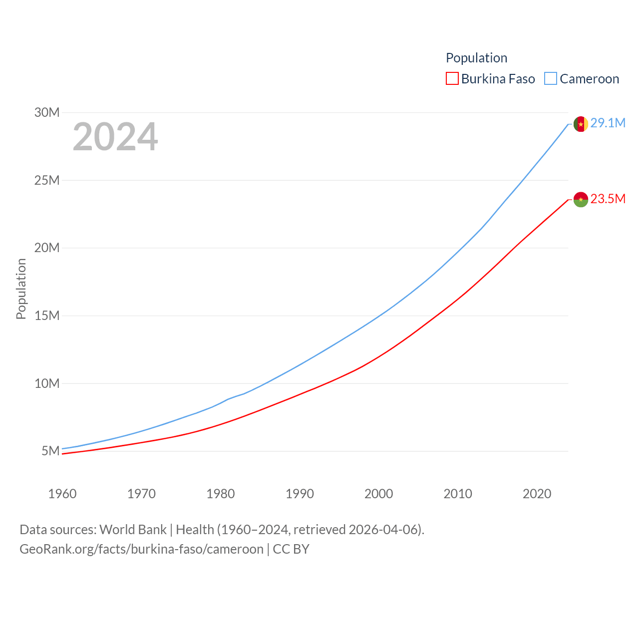 Burkina Faso has a population of 23.5M (ranked 59/197), compared with 29.1M in Cameroon (ranked 52/197). Burkina Faso's land area is 105,638 sq mi versus 182,514 sq mi for Cameroon (ranked 73rd vs. 52nd).