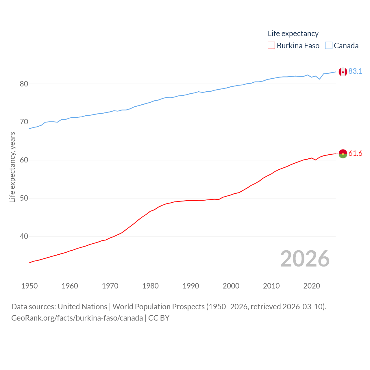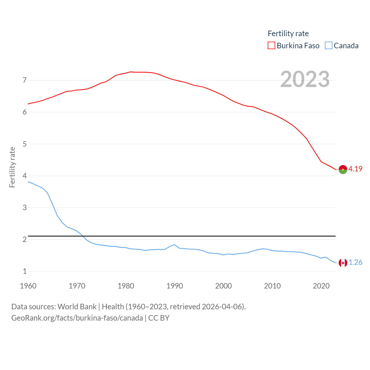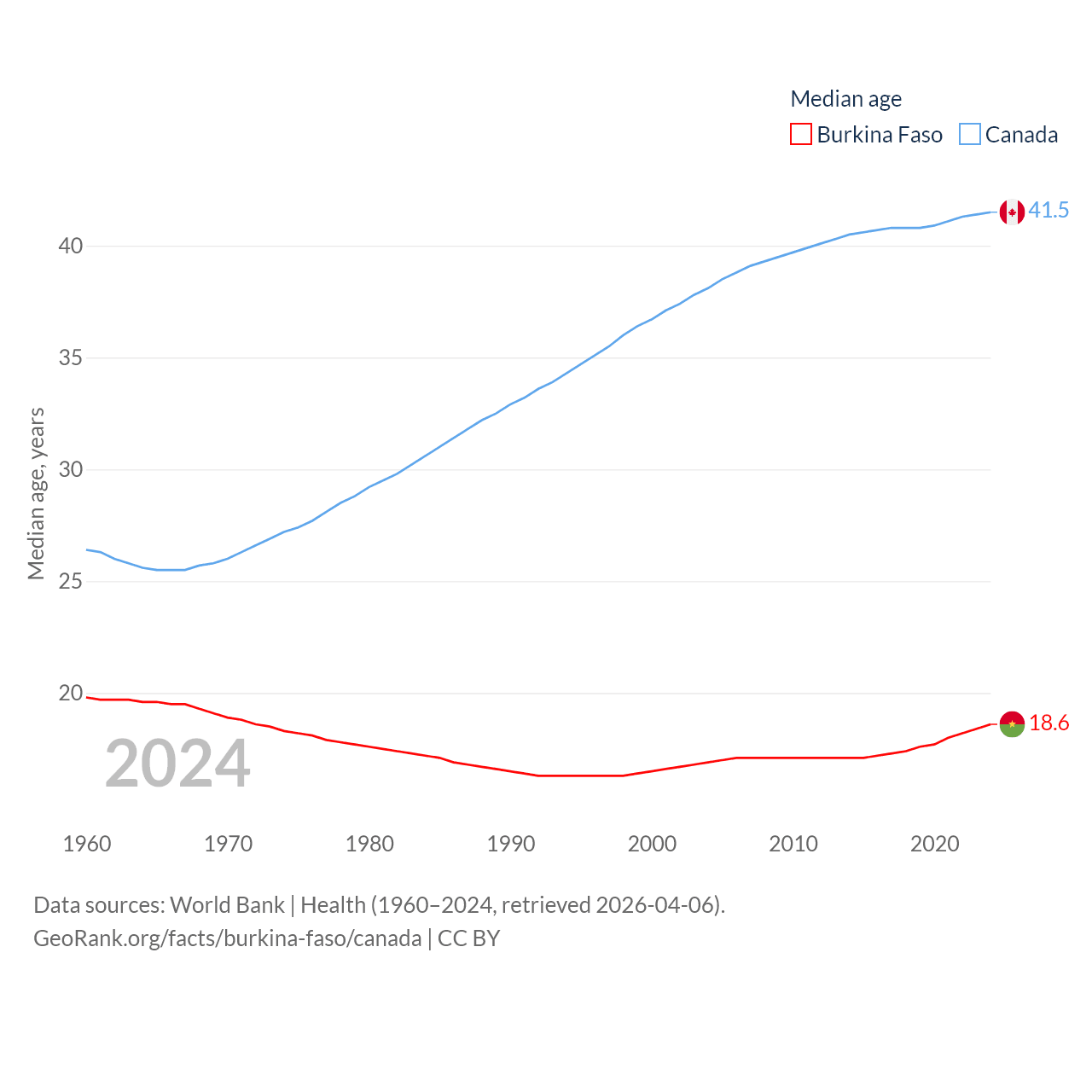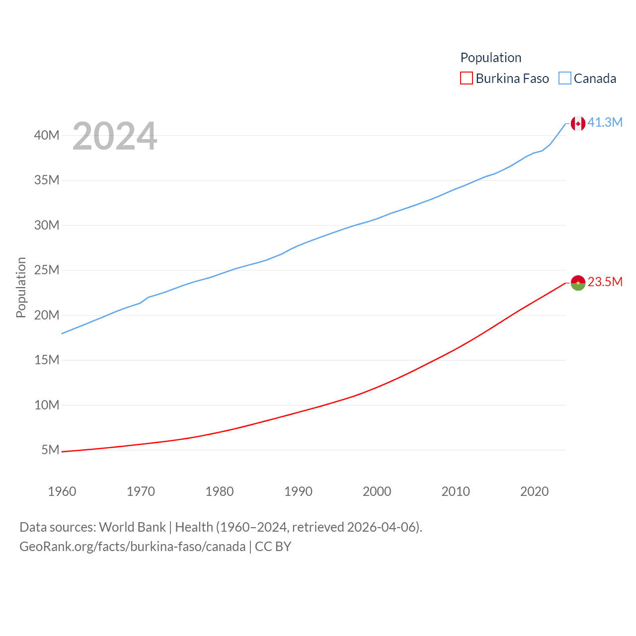Burkina Faso has a population of 23.5M (ranked 59/197), compared with 41.3M in Canada (ranked 37/197). Burkina Faso's land area is 105,638 sq mi versus 3,393,336 sq mi for Canada (ranked 73rd vs. 4th).