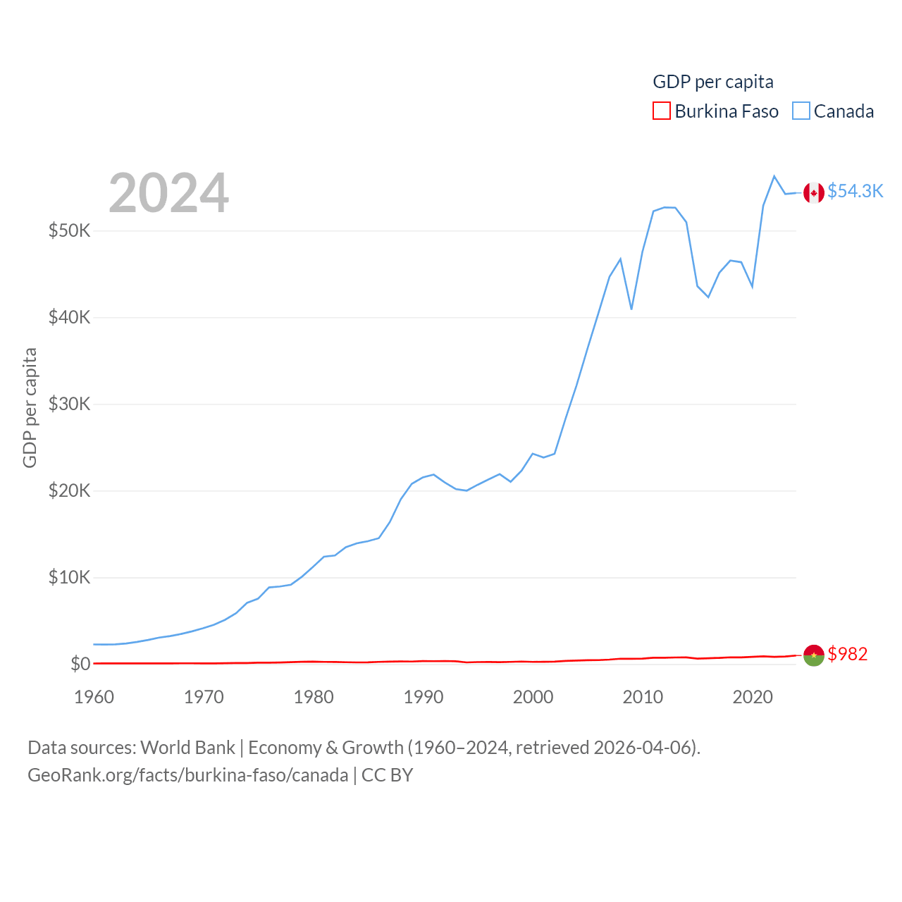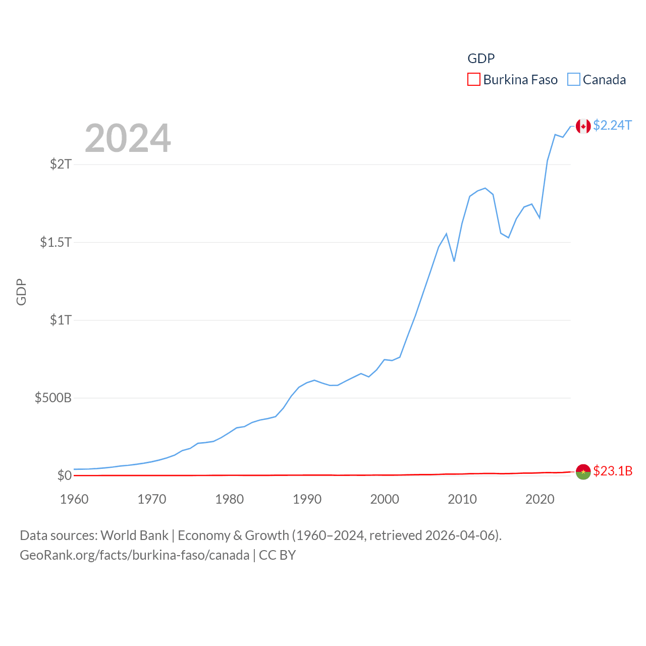 By GDP, Burkina Faso ranks 122/197 ($23.1B) and Canada ranks 9/197 ($2.24T). By GDP per capita, Burkina Faso ranks 180/197 ($982), while Canada ranks 20/197 ($54,340).