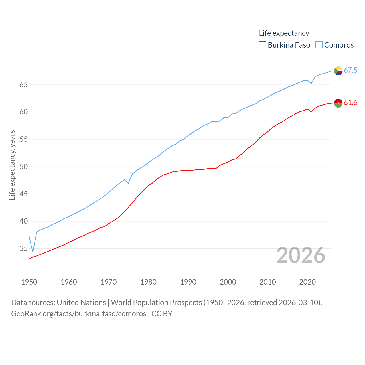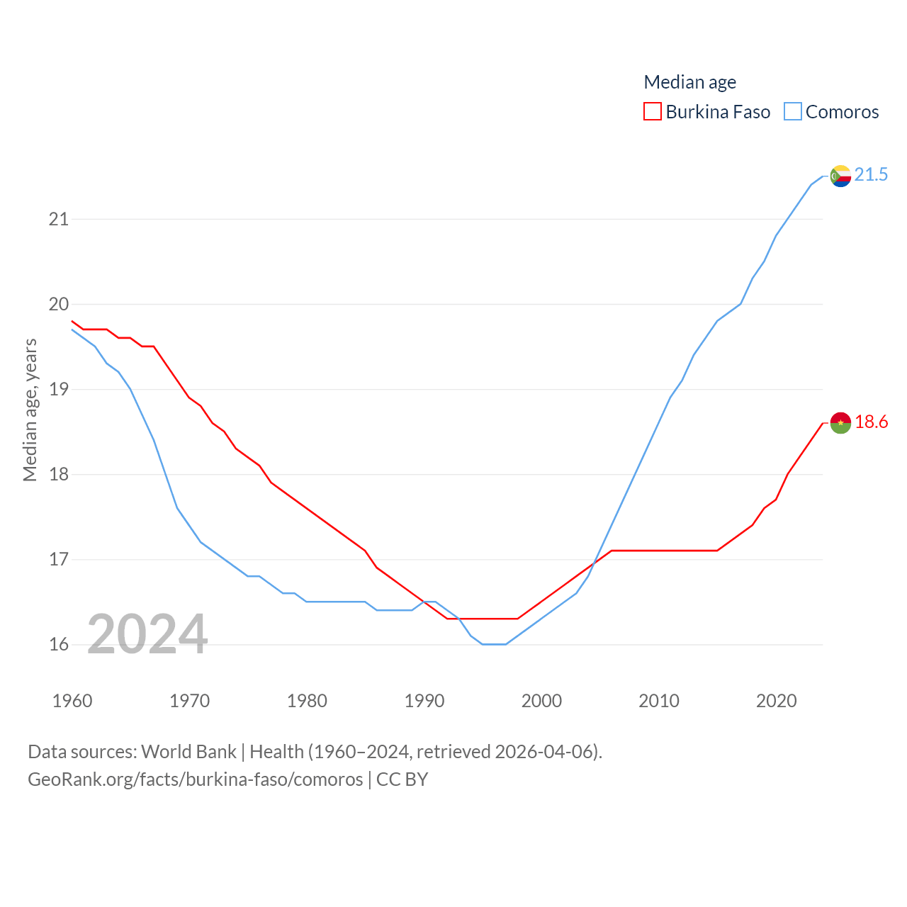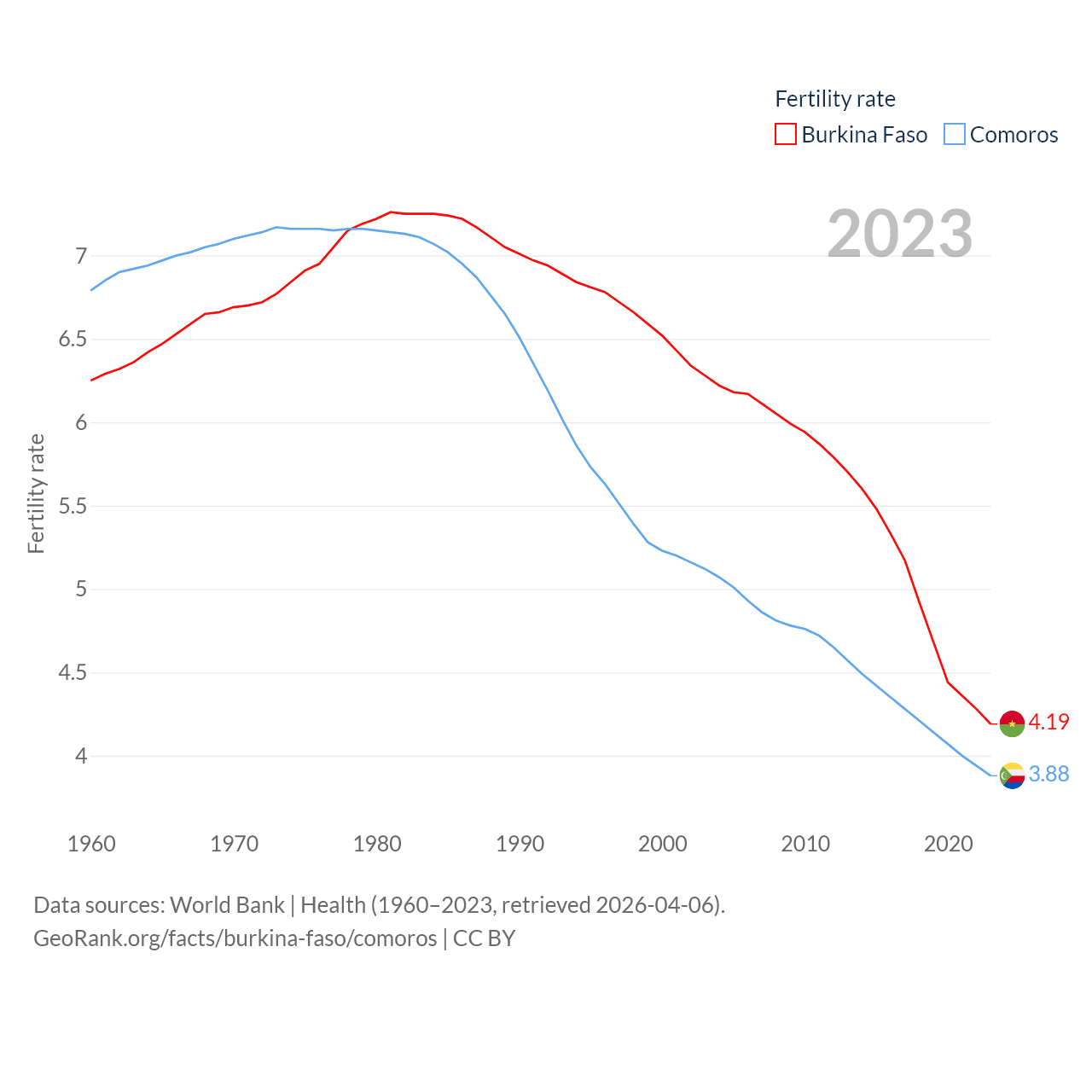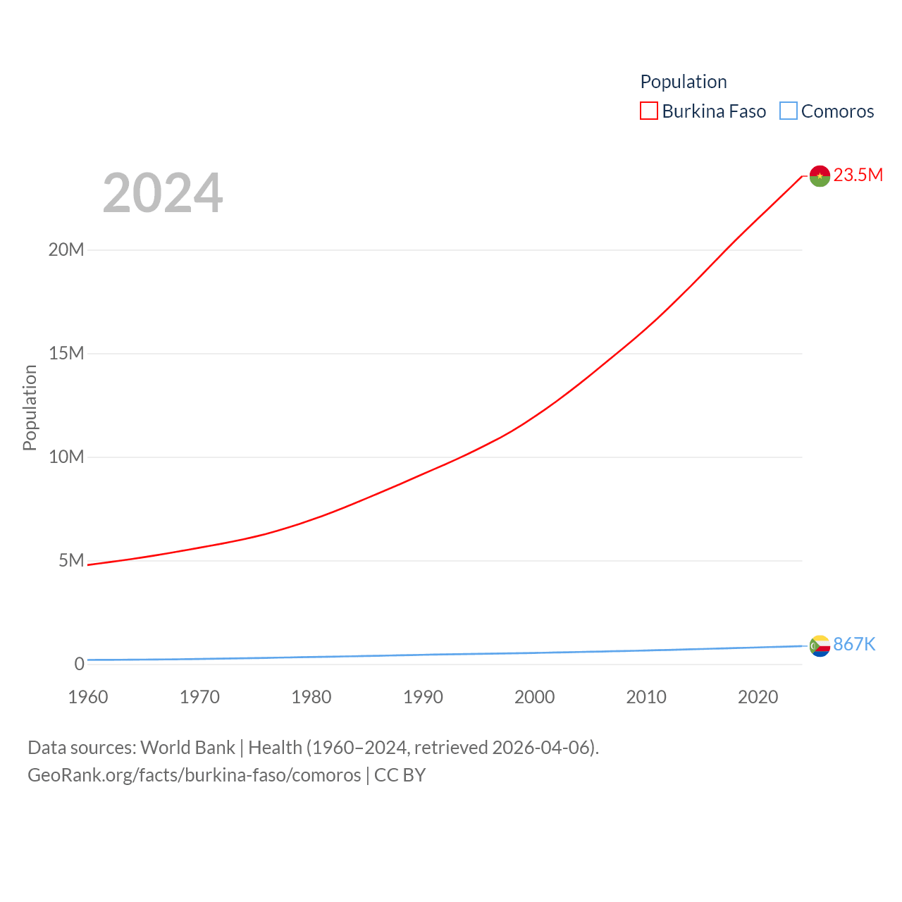 Burkina Faso has a population of 23.5M (ranked 59/197), compared with 867K in Comoros (ranked 160/197). Burkina Faso's land area is 105,638 sq mi versus 719 sq mi for Comoros (ranked 73rd vs. 171st).