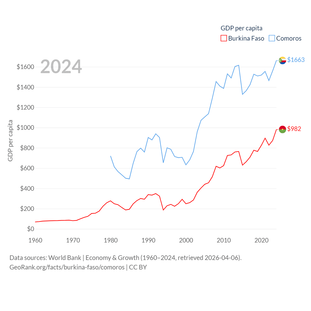 By GDP, Burkina Faso ranks 122/197 ($23.1B) and Comoros ranks 183/197 ($1.44B). By GDP per capita, Burkina Faso ranks 180/197 ($982), while Comoros ranks 161/197 ($1,663).