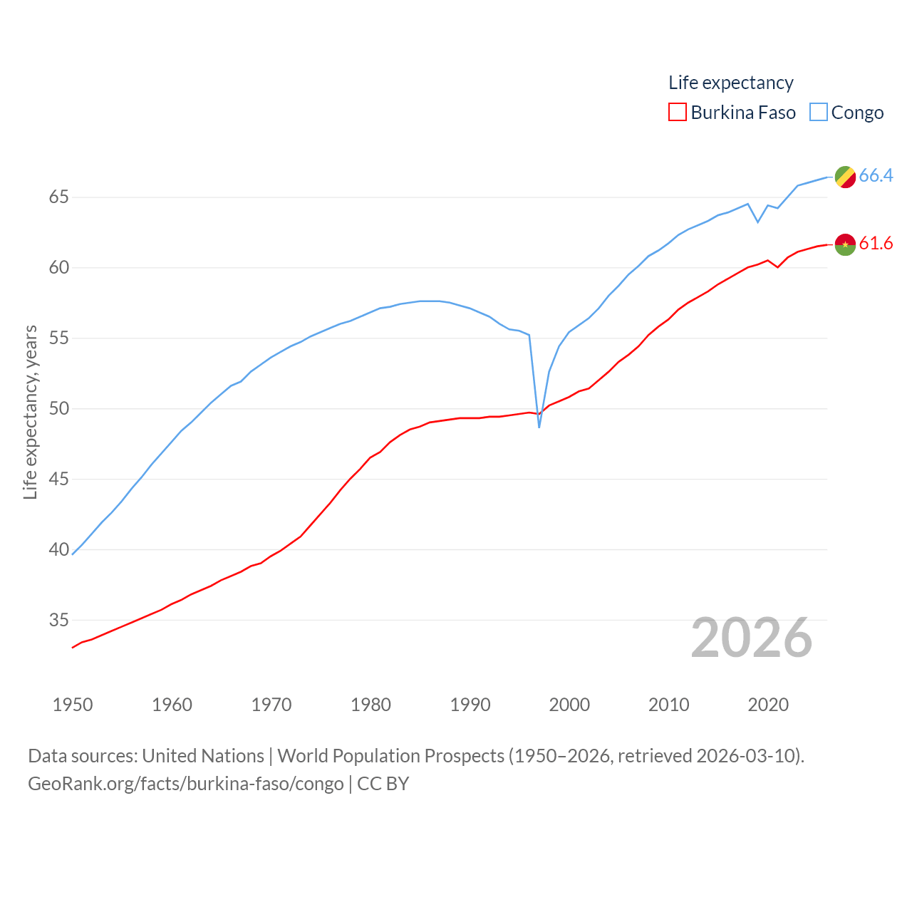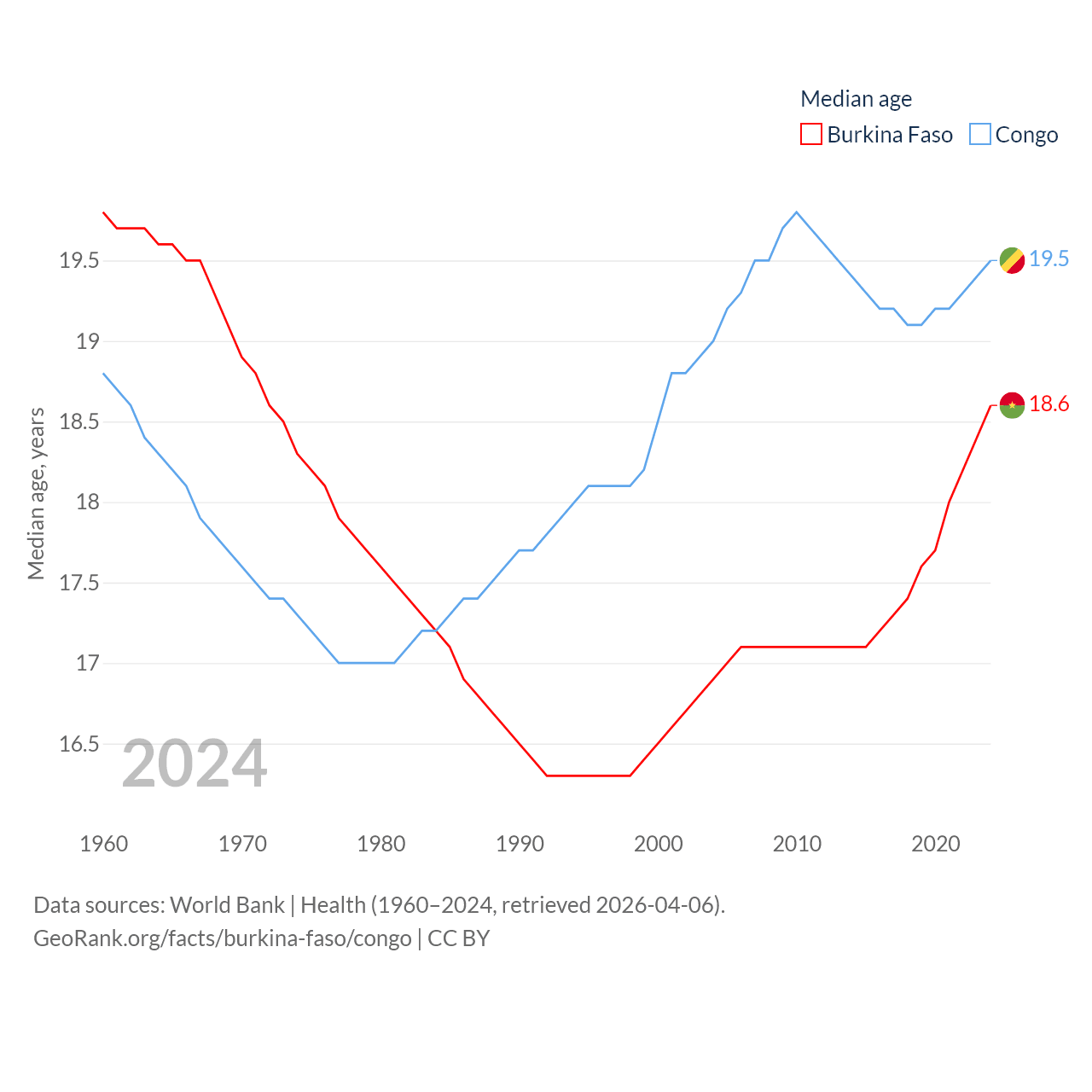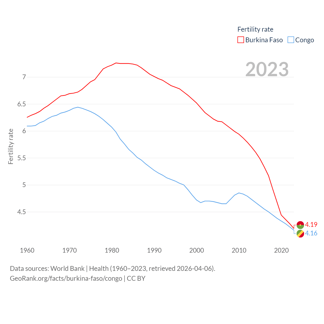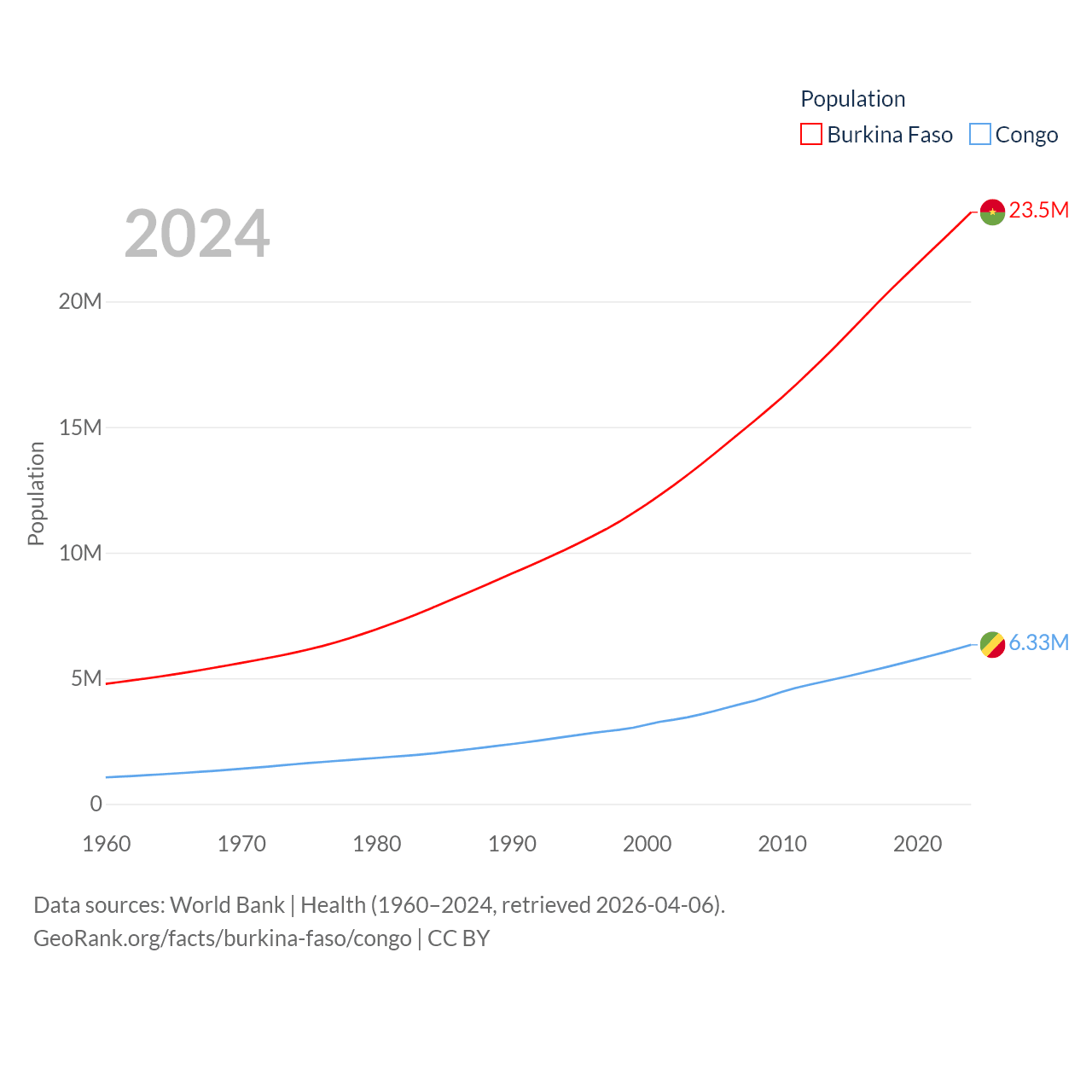 Burkina Faso has a population of 23.5M (ranked 59/197), compared with 6.33M in The Congo (ranked 112/197). Burkina Faso's land area is 105,638 sq mi versus 131,854 sq mi for The Congo (ranked 73rd vs. 64th).