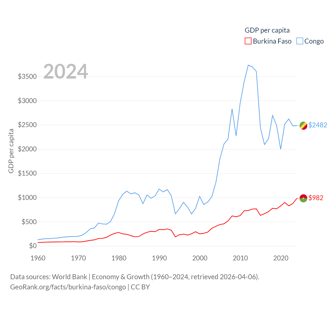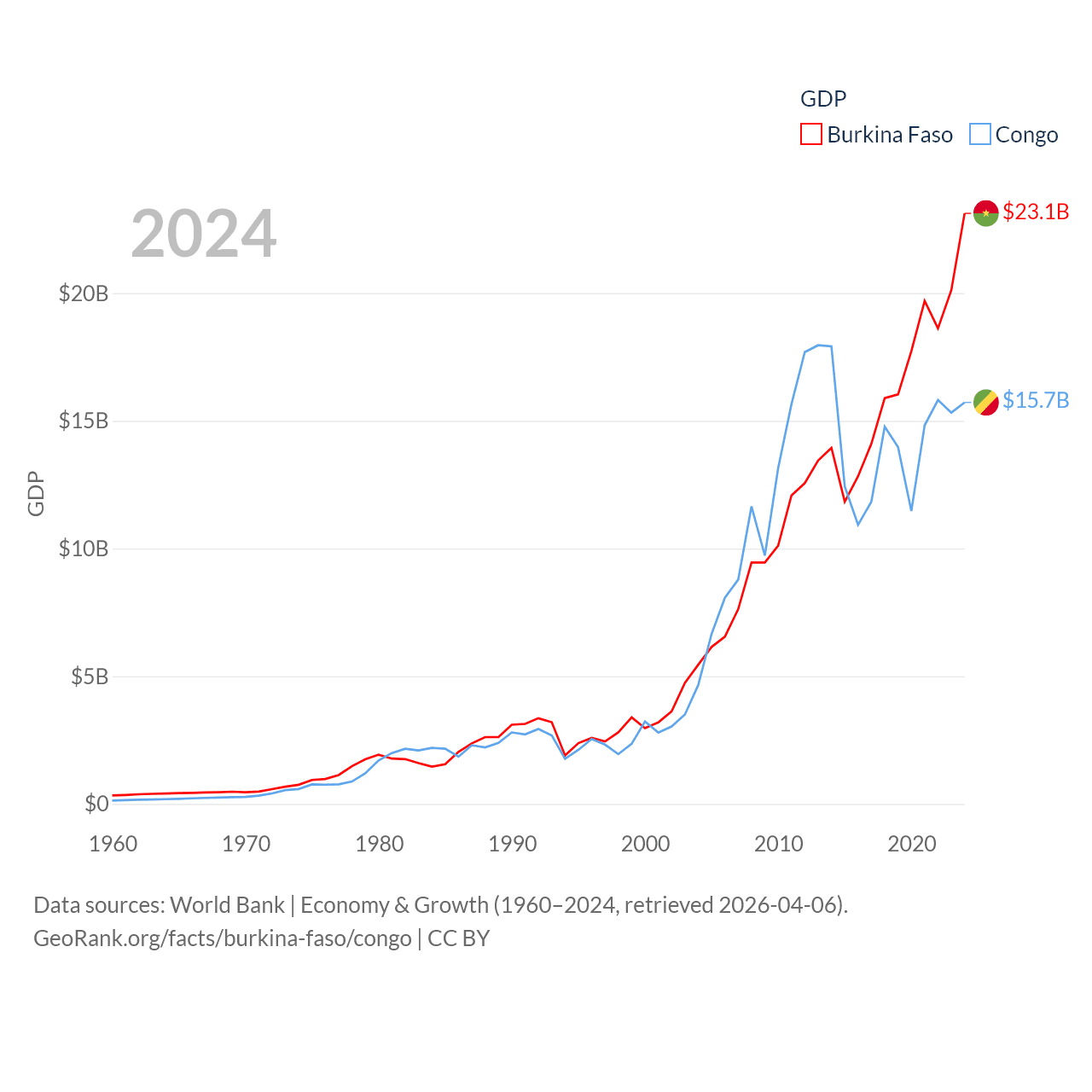 By GDP, Burkina Faso ranks 122/197 ($23.1B) and The Congo ranks 141/197 ($15.7B). By GDP per capita, Burkina Faso ranks 180/197 ($982), while The Congo ranks 149/197 ($2,482).