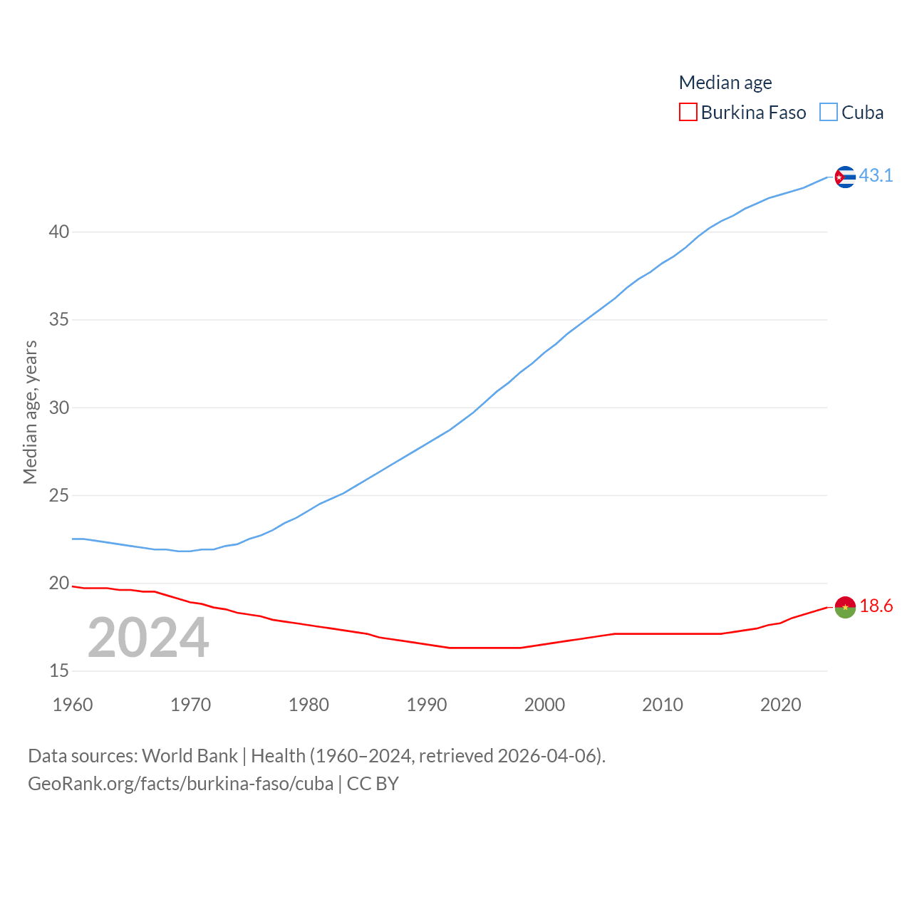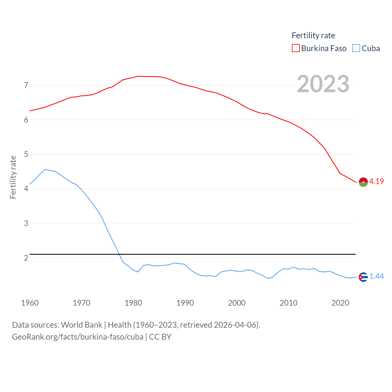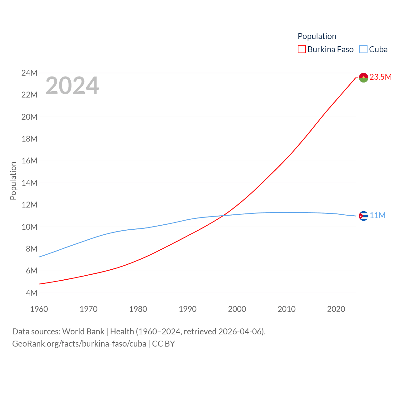 Burkina Faso has a population of 23.5M (ranked 59/197), compared with 11M in Cuba (ranked 87/197). Burkina Faso's land area is 105,638 sq mi versus 40,077 sq mi for Cuba (ranked 73rd vs. 103rd).